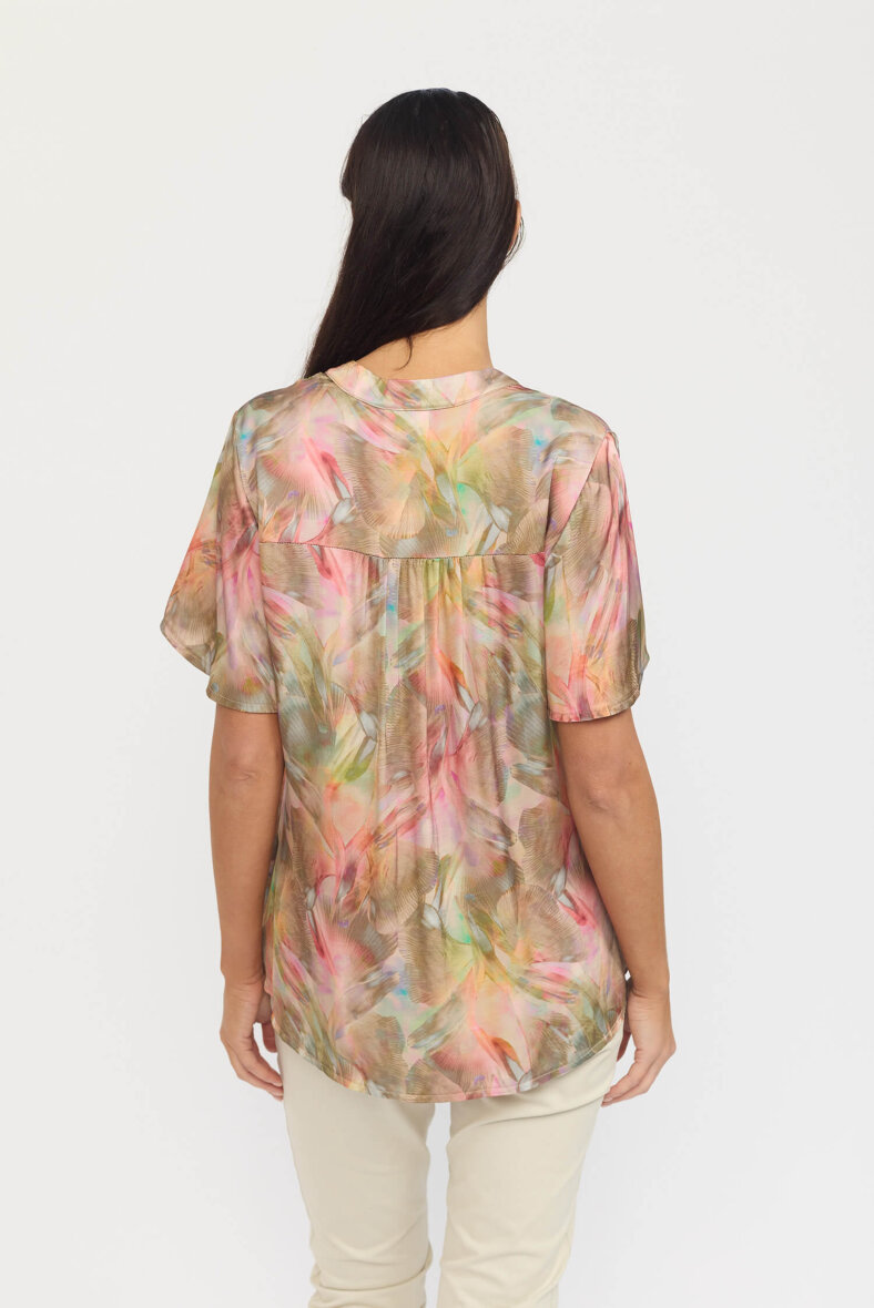 2-biz bluse i fineste bladprint i et mix af rosa og grønne nuancer.