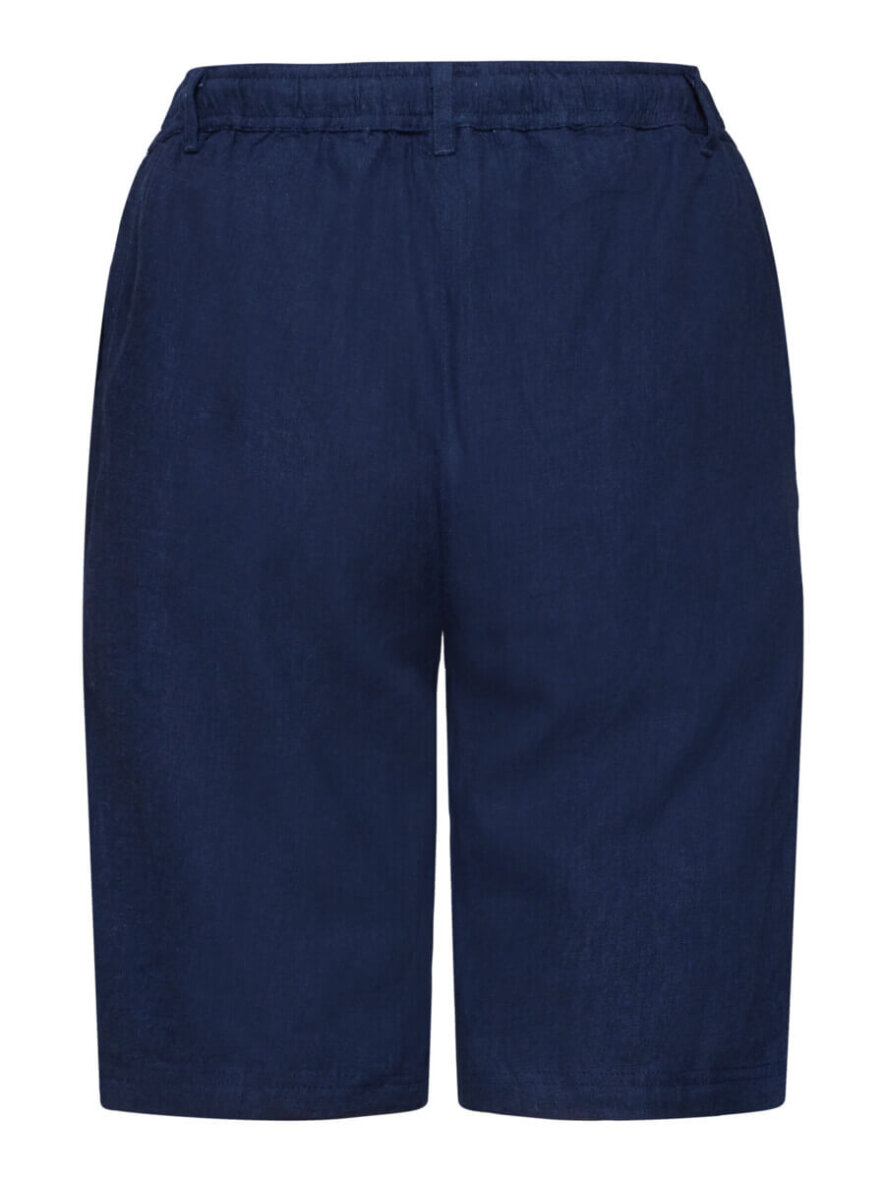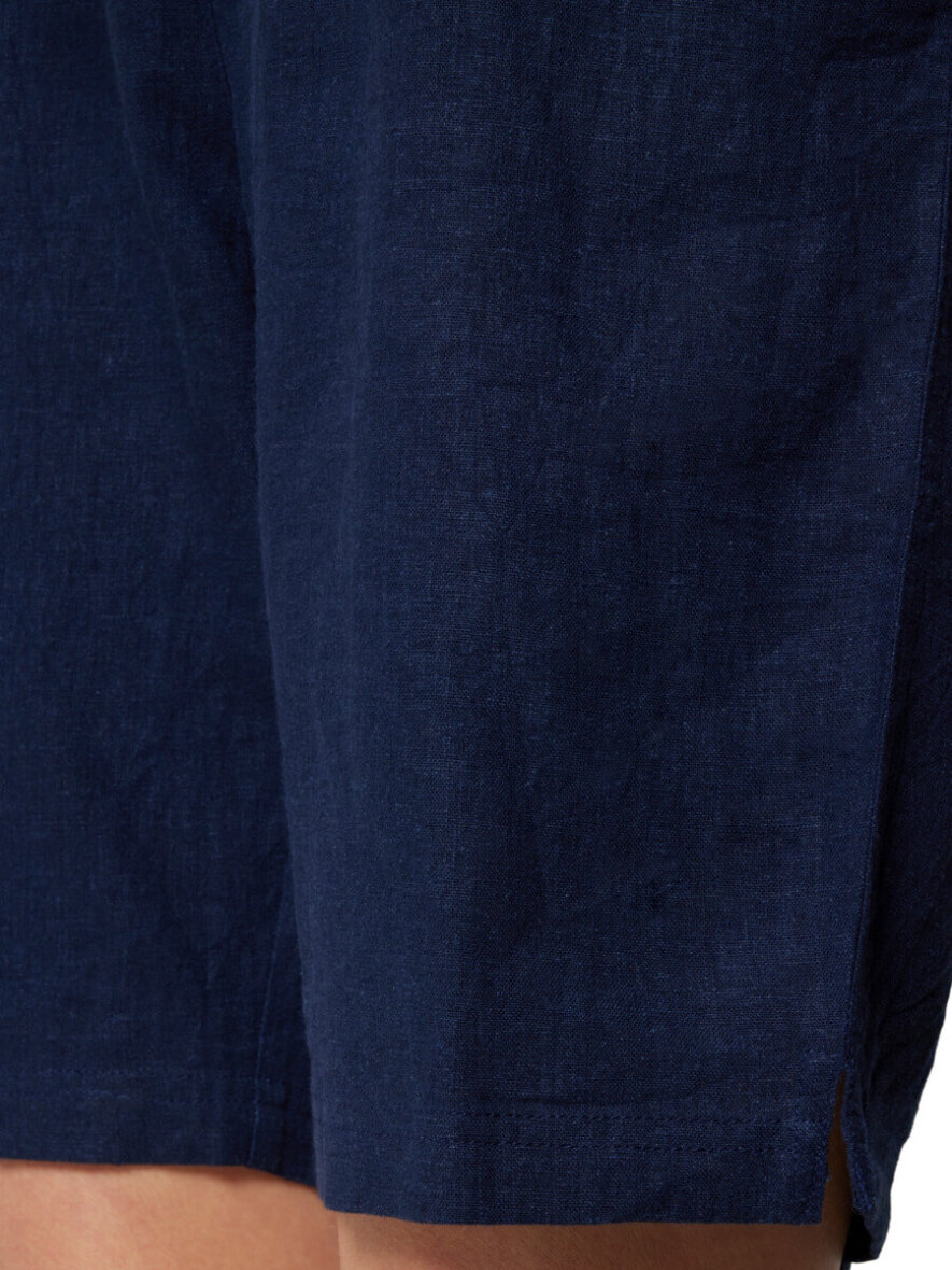 De mørkeblå shorts er med skrålommer, bæltestropper og en lille slids ved buksebenet.