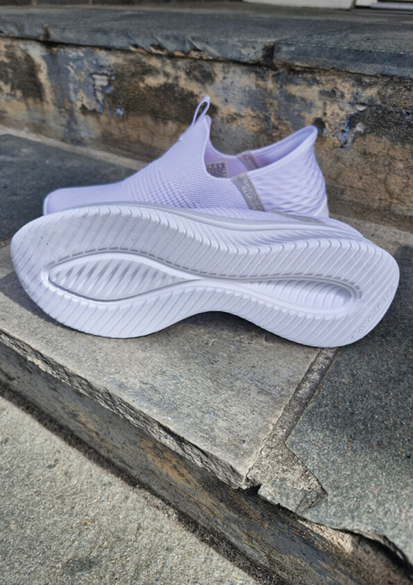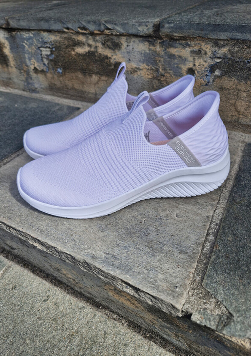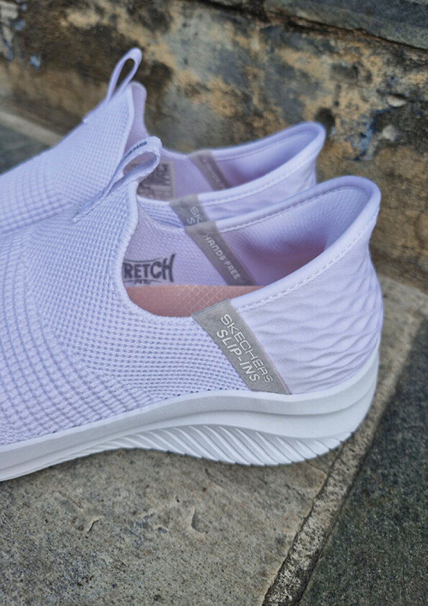 Lette hvide hands free slip-ins: Ultra Flex 3.0 - Cozy Streak fra Skechers. Skoen er lavet i blødt vævet mesh tekstil med stretch fit, som giver en sok-lignende komfort, som tilpasser sig foden. God og fleksibel pasform uden snøre.