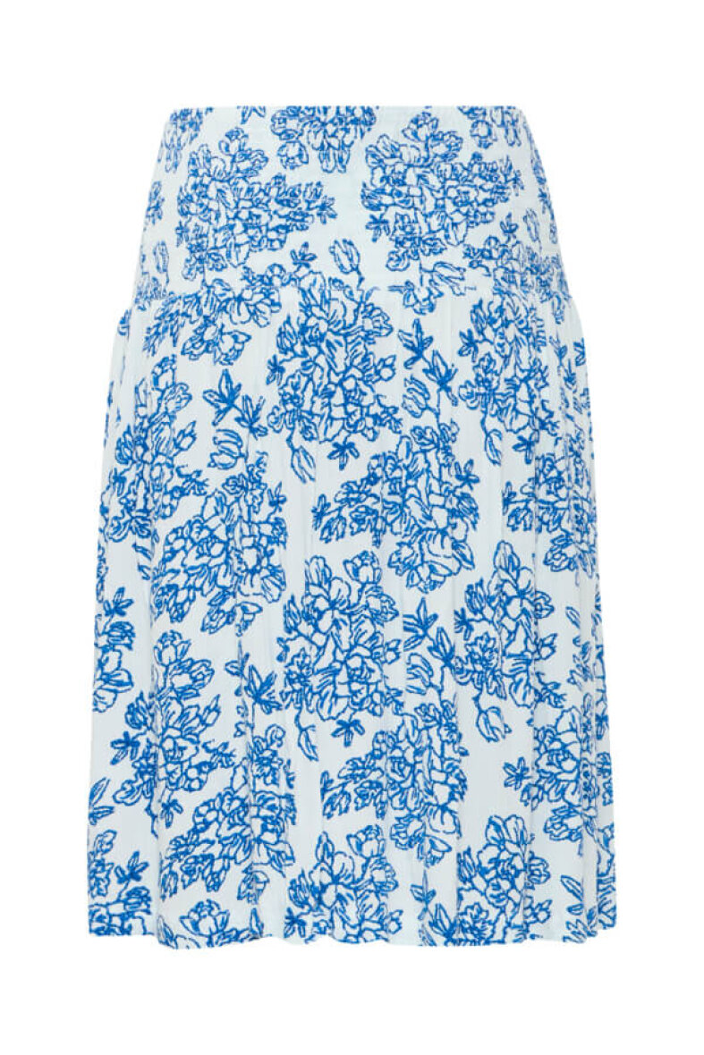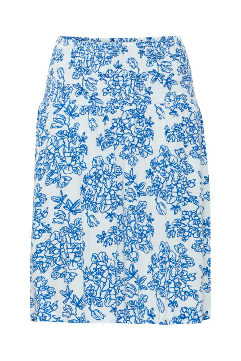 Smuk blå blomstret hvid nederdel fra Fransa. Nederdelen er lavet af 100% viskose og har et afslappet snit med smock kant i taljen.