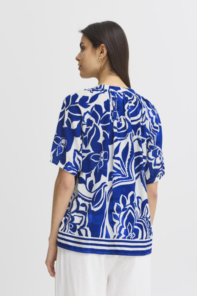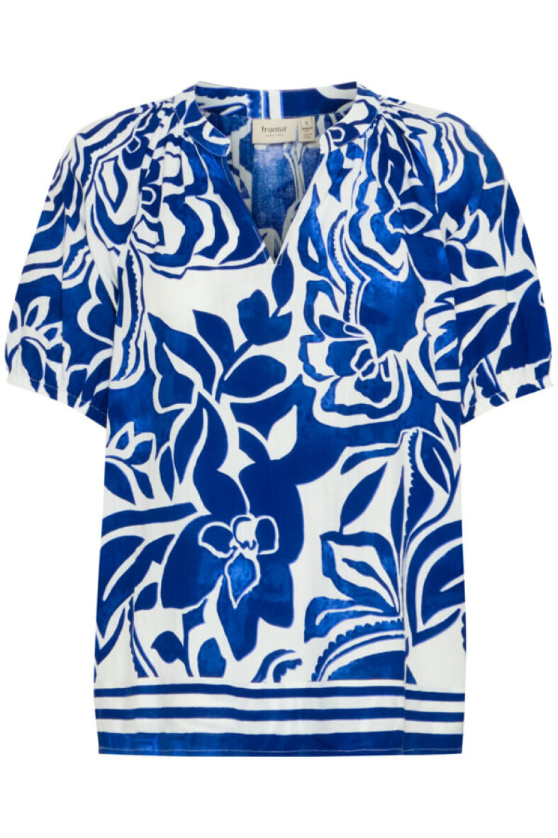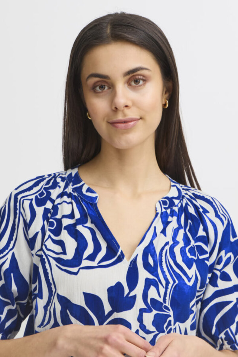 Fransa blusen FRCORA er lavet i et smukt print i farverne hvid og blå. Blusen er med en påsyet kant nederst i et stribet design.