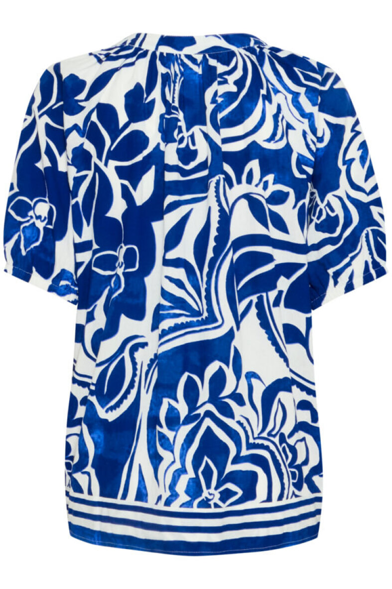 Blusen er med korte ærmer som afsluttes med elastik kant, hvilket er med til at give en feminin ballon effekt. Blusen er med v-halsudskæring med små læg i stoffet på fronten og bagpå, hvilket giver en flot effekt.