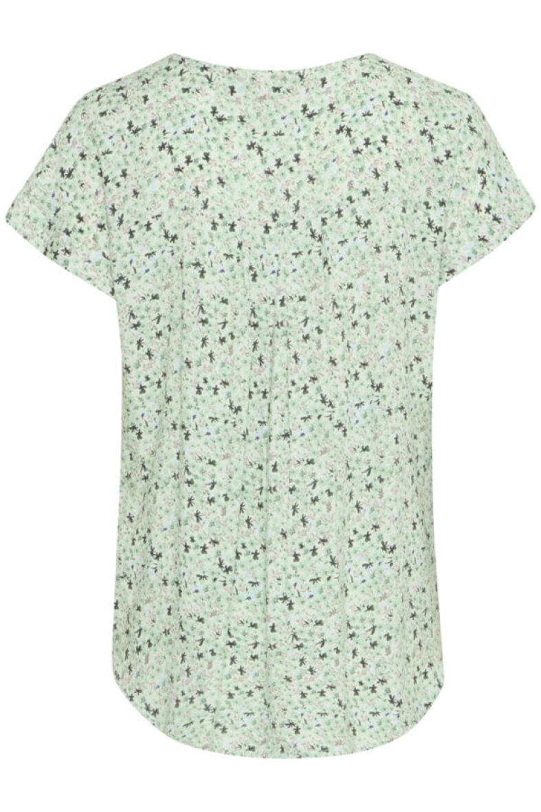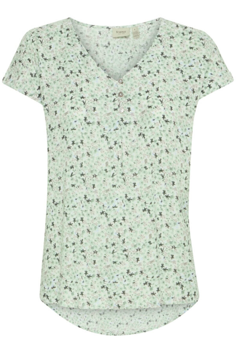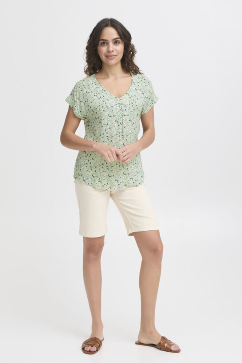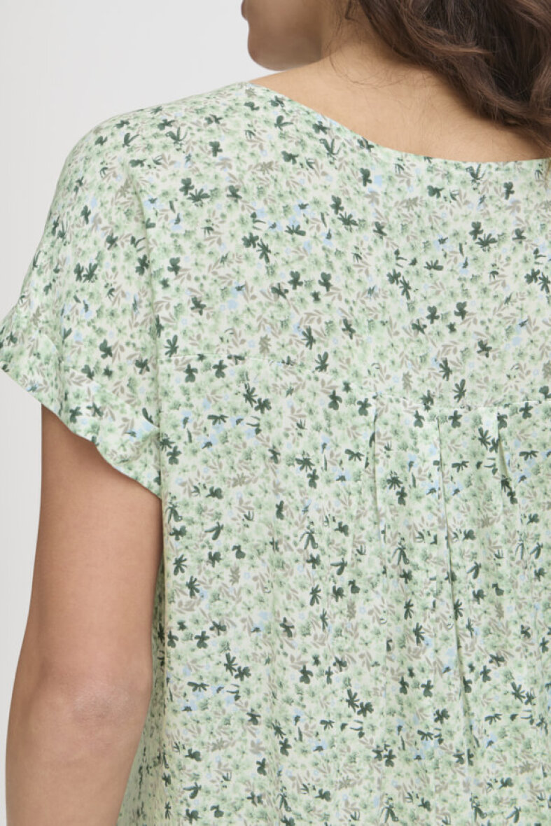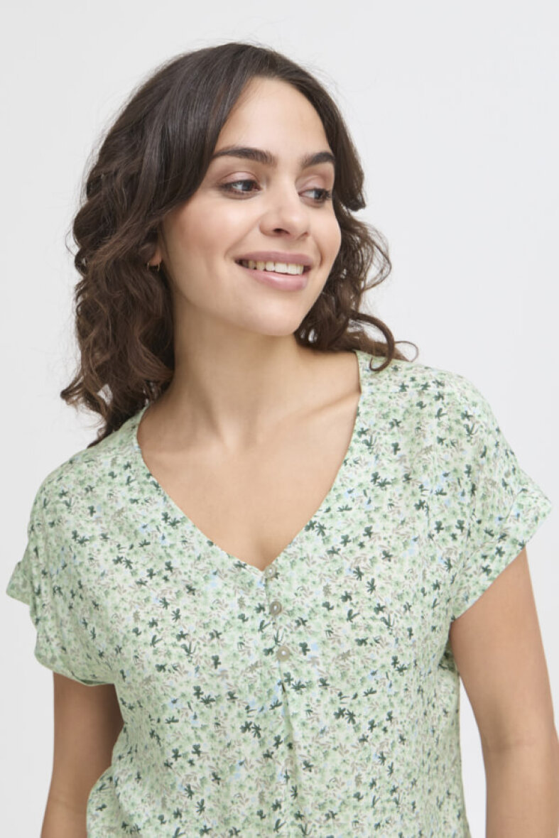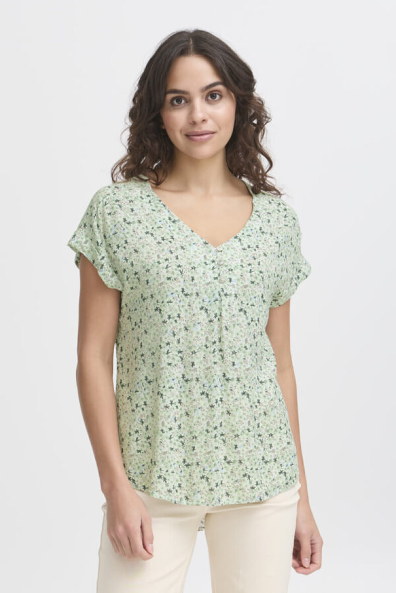 Flot og feminin Fransa bluse i modellen FRHEAT. Blusen er lavet i et blomstret print i grønne nuancer. Blusen er lavet i en lækker 100% viskose kvalitet.