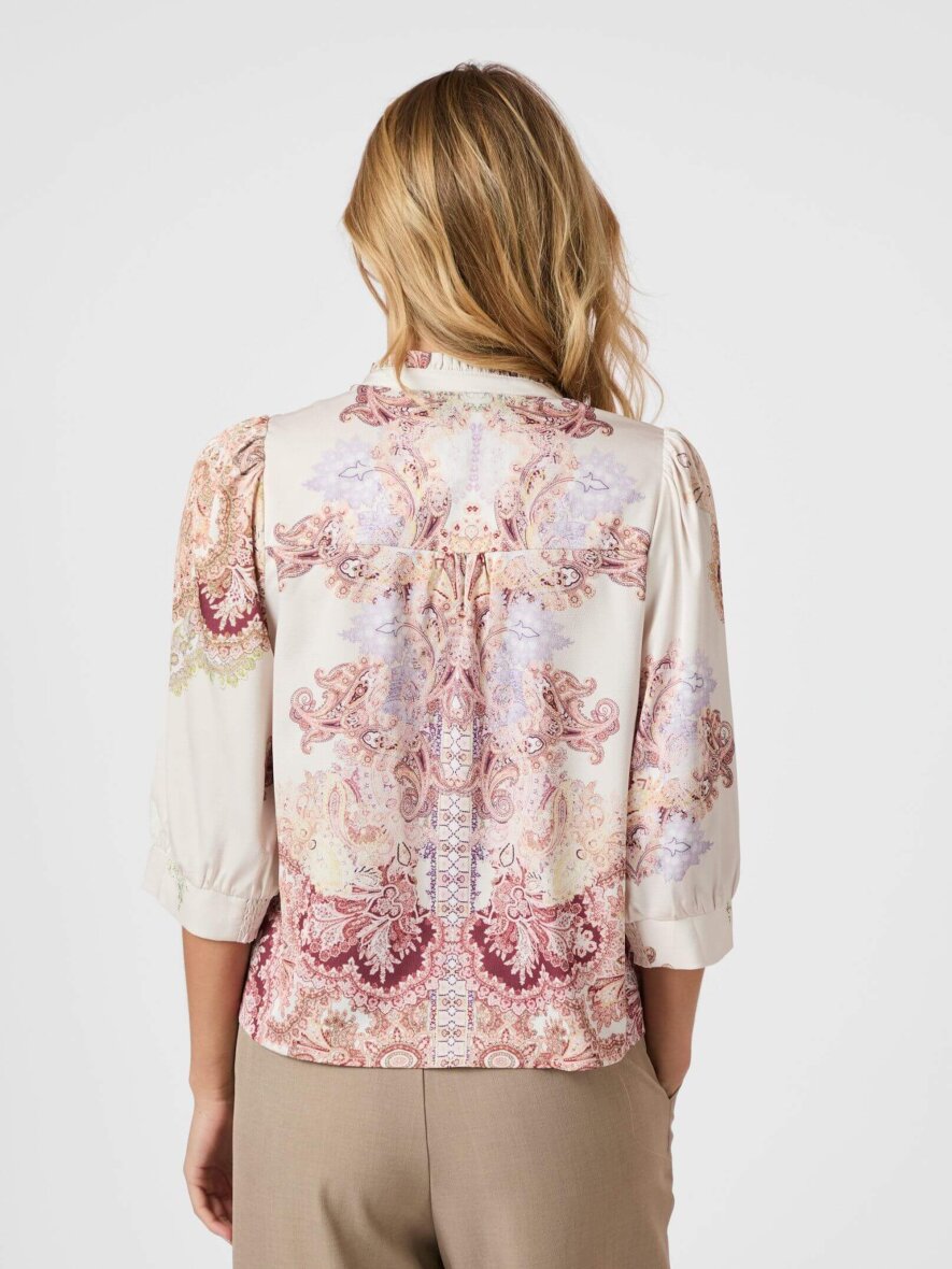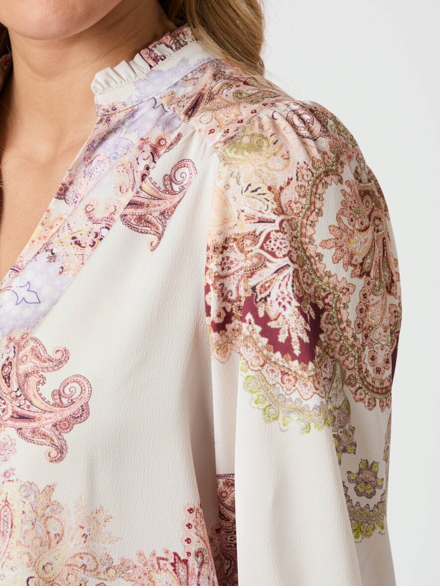Blusen er med rund hals med kina krave og flæse detalje, hvilket giveret feminint touch til blusen. Blusens v-halsudskæring er med gennemgående små knapper langs fronten. Blusens 3/4 lange ærmer er med kant og et lille smock stykke, hvilket giver en flot ballon effekt.