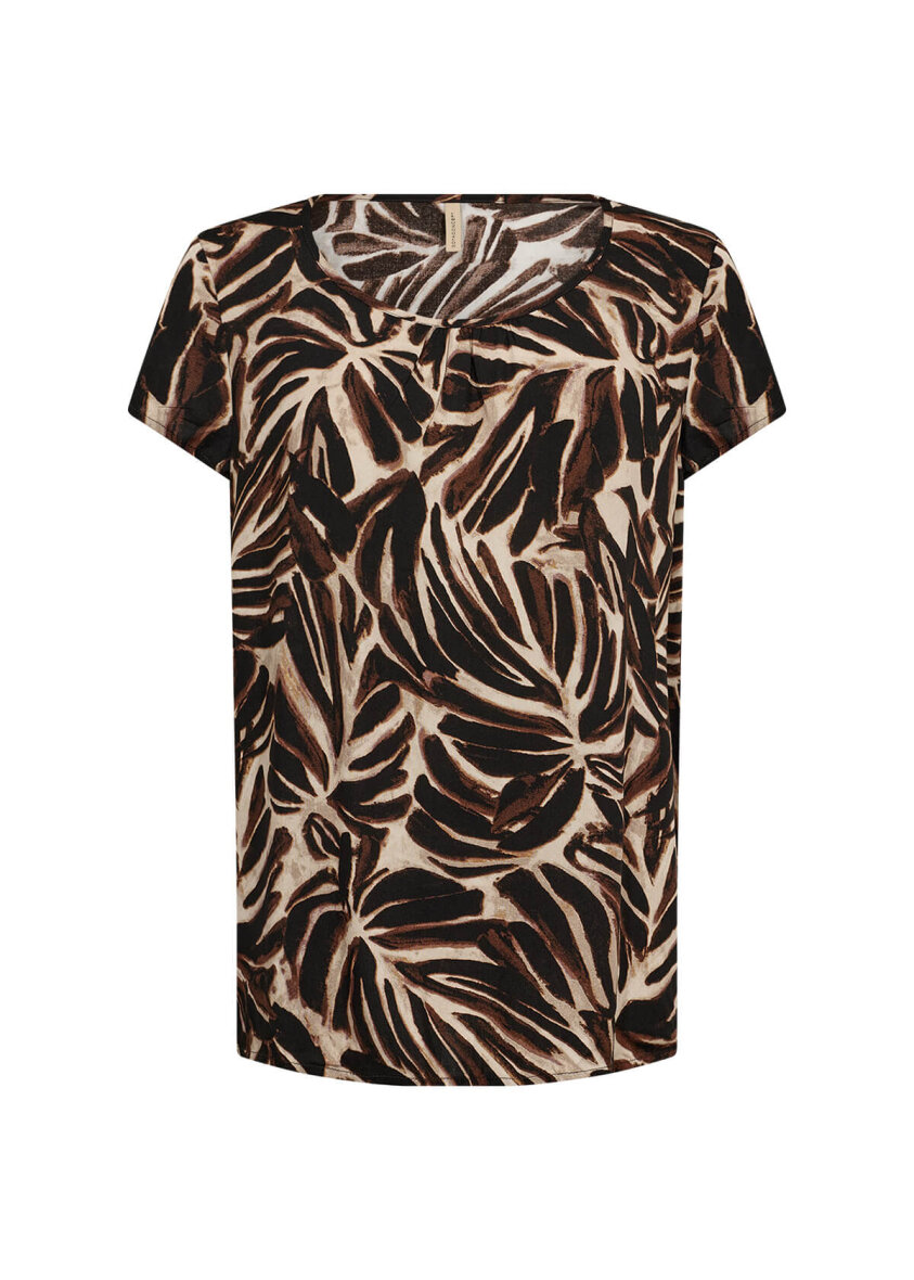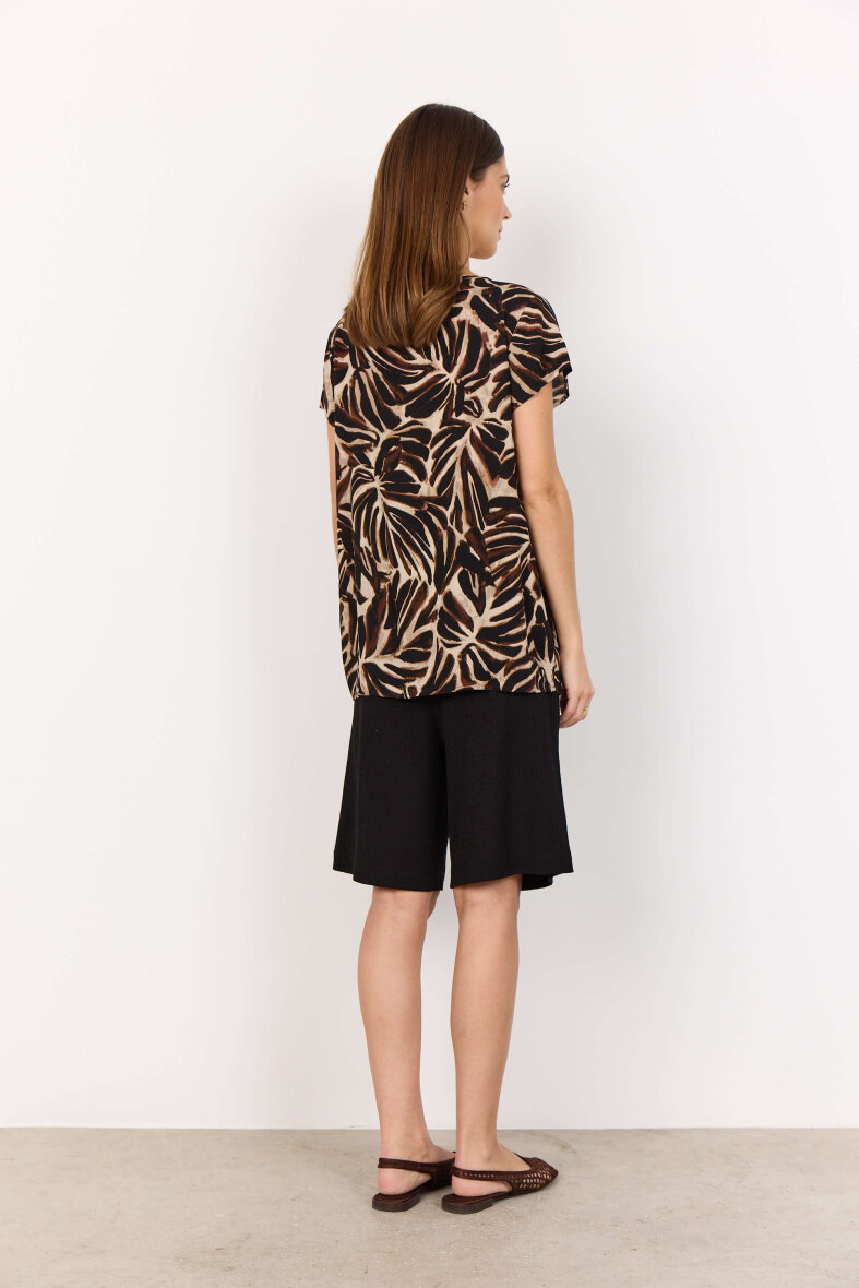 Flot kortærmet bluse fra Soyaconcept i modellen Roksana. Blusen er lavet i et tropisk bladprint i brune og beige nuancer.