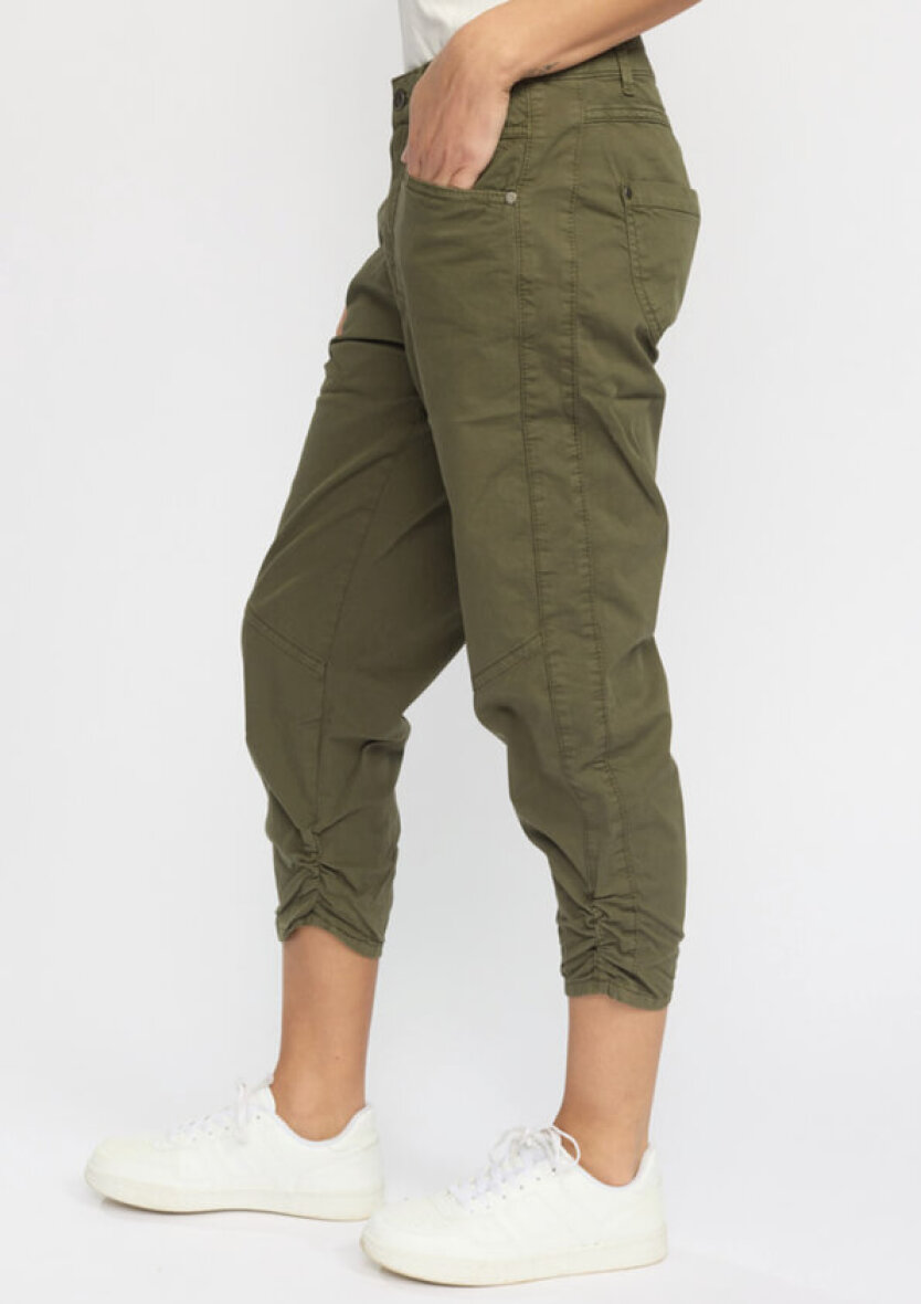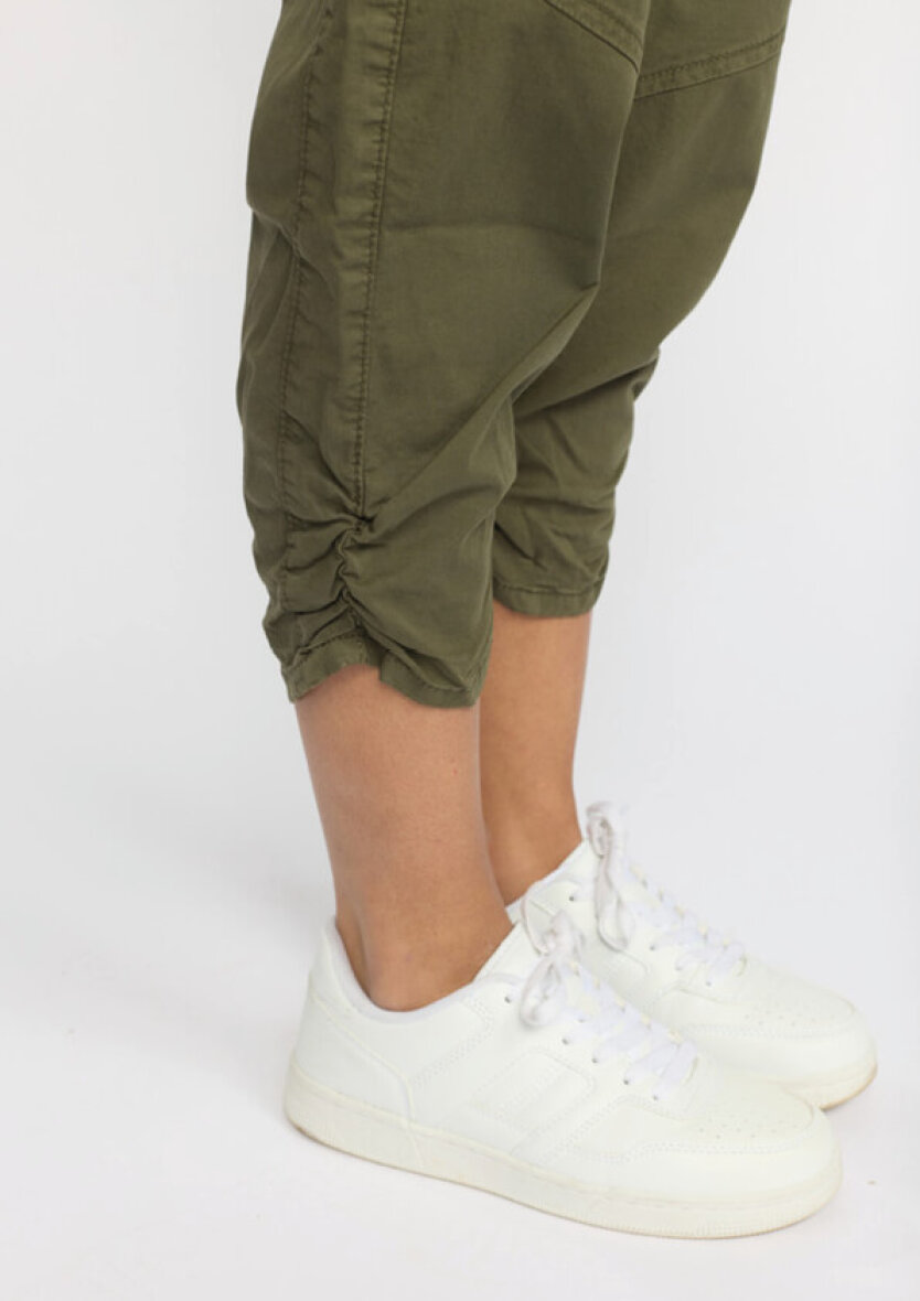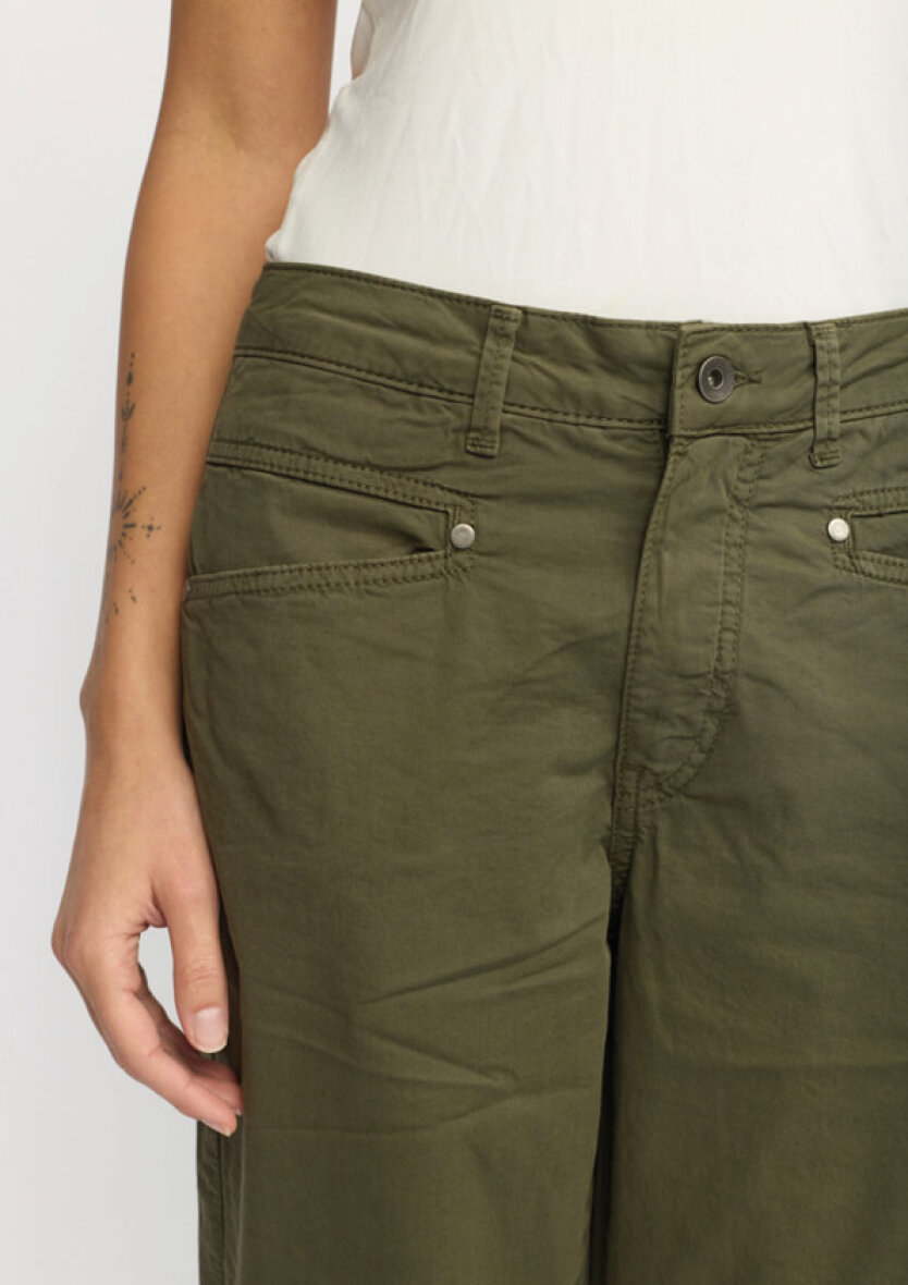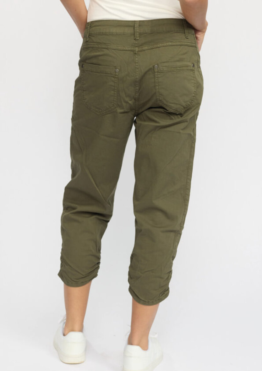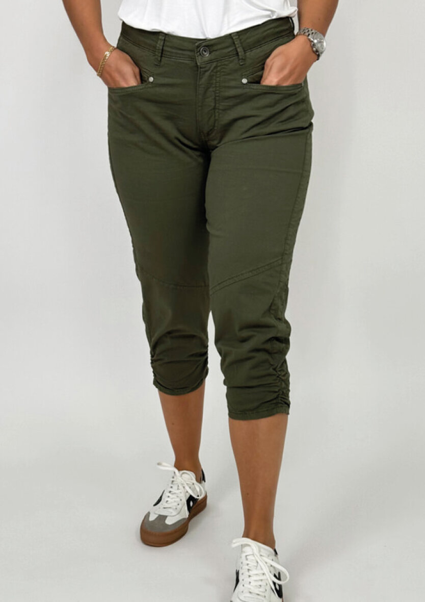 De khaki grønne denim bukser er den perfekte sommerbuks i komfortabel bomuldskvalitet med stræk. Stumpbuksen er med en fin rynke detalje nederst på buksebenet og overskæring ved knæet.
