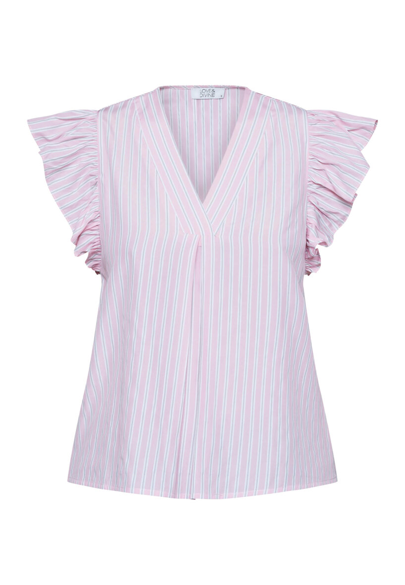 Sød bluse i stribet design fra Love & Divine. Blusen er lavet i en feminin baby lyserød farve med hvide striber og sort striblet design inde i de hvide striber, hvilket giver et fedt design.
