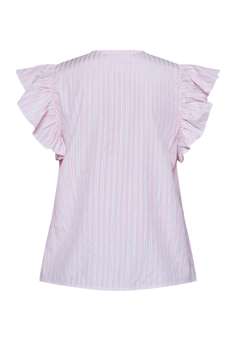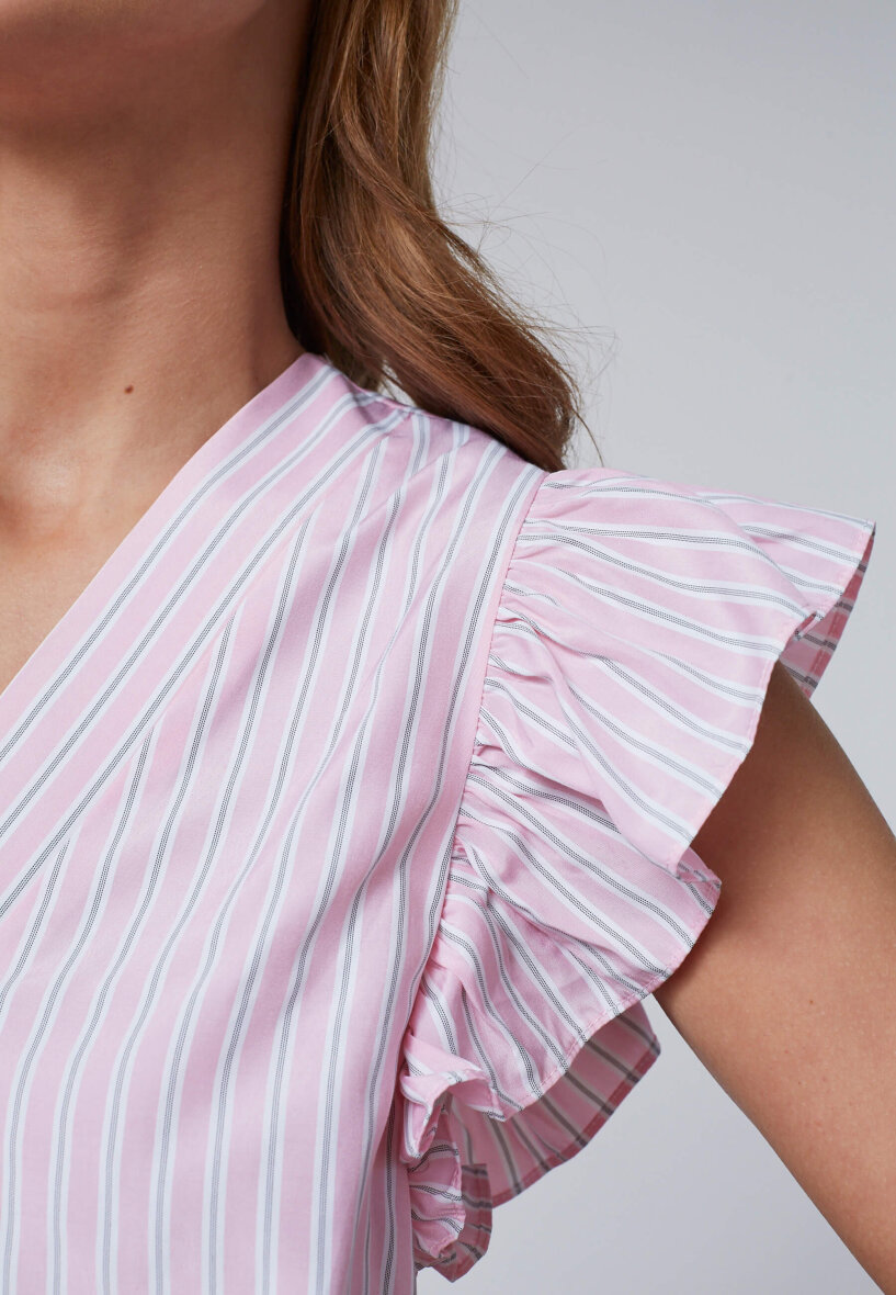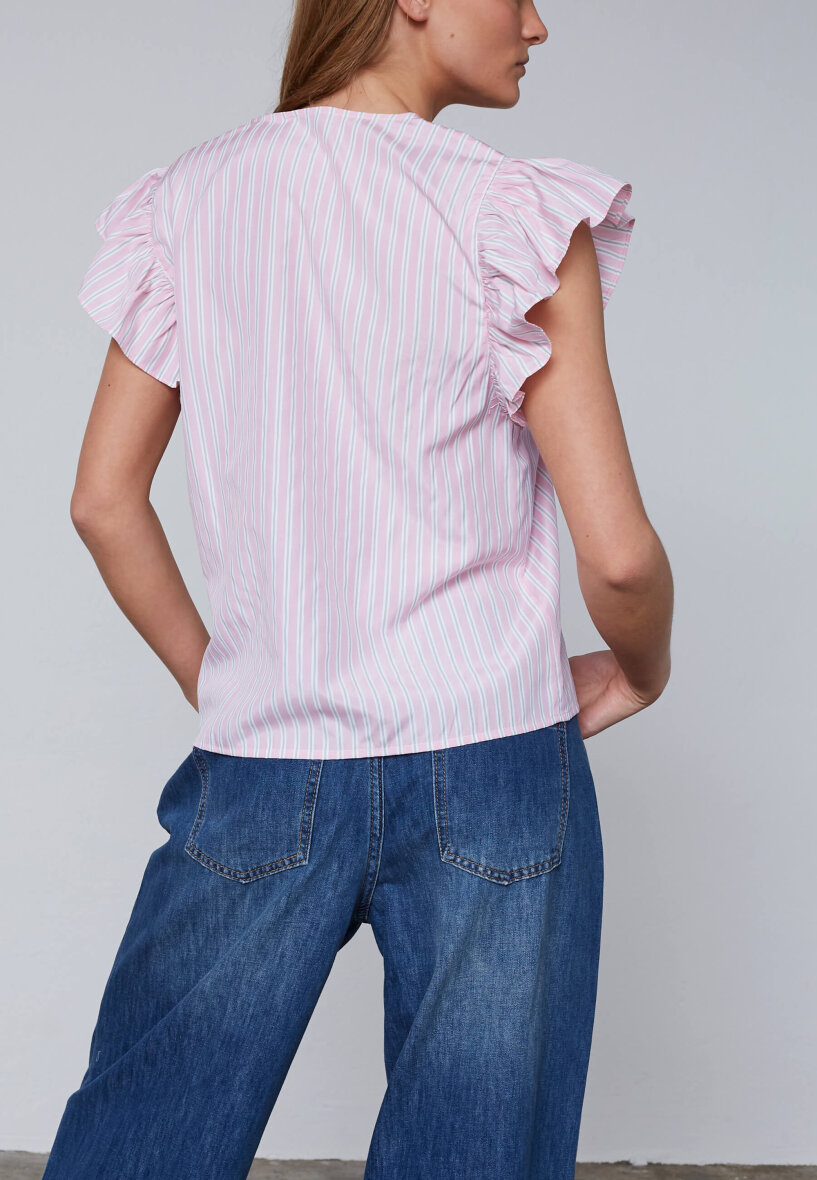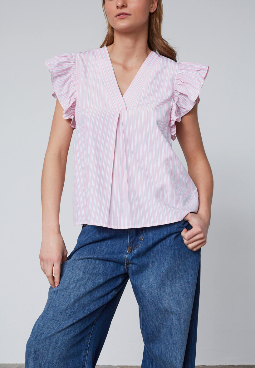 Blusens korte ærmer er med flæser og er med til at give blusen et feminint touch.