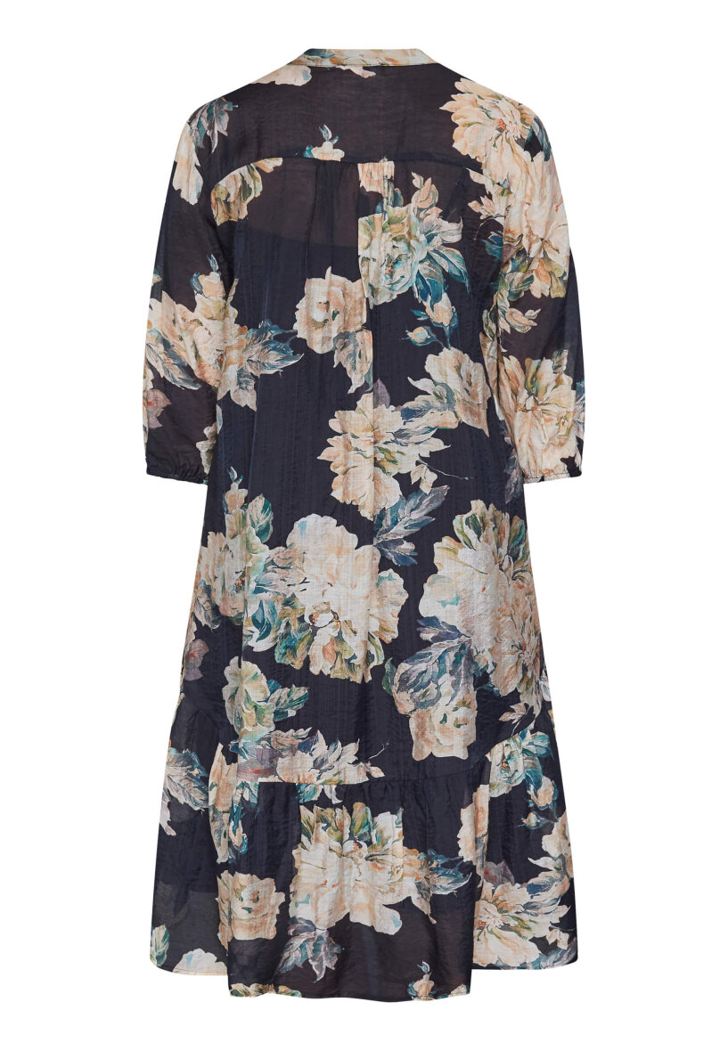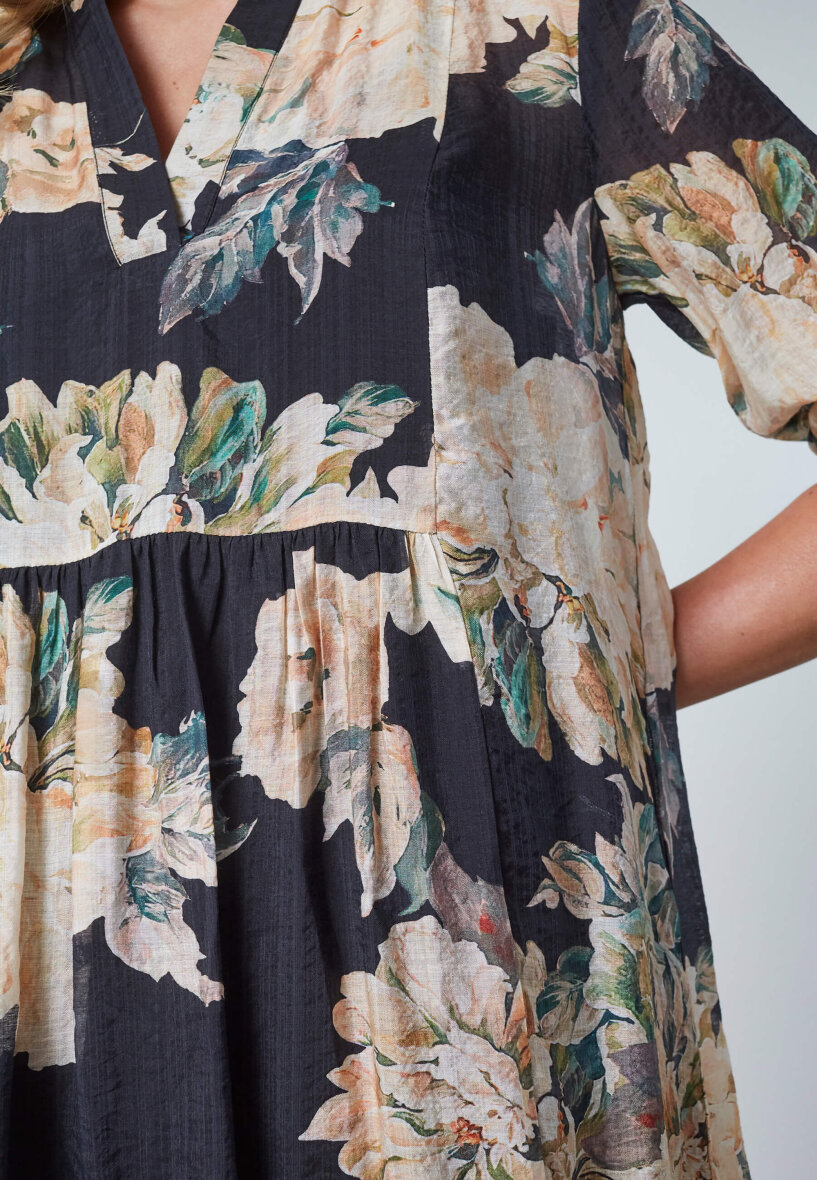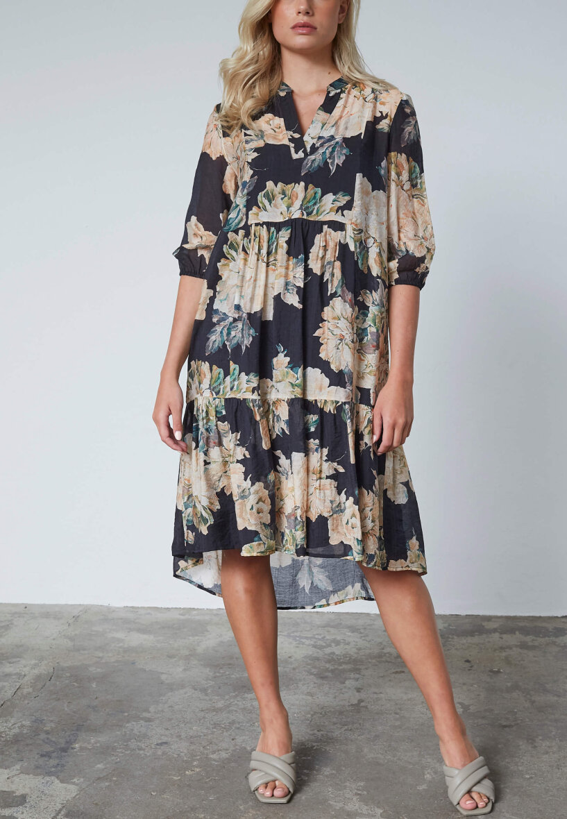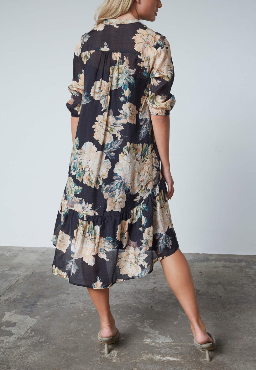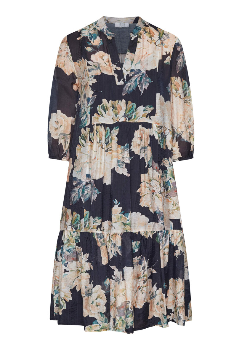 Smuk kjole i det flotteste blomstret design fra Love & Divine. Den sorte kjole er med blomster i lyse beige / sandfarvet toner samt grønne blade i designet.