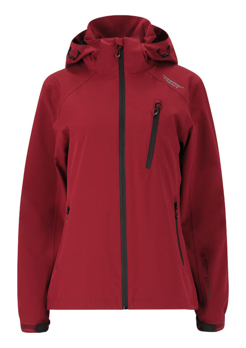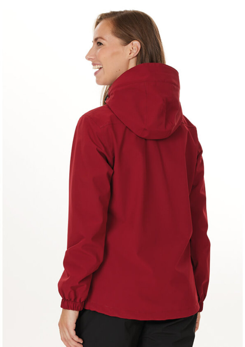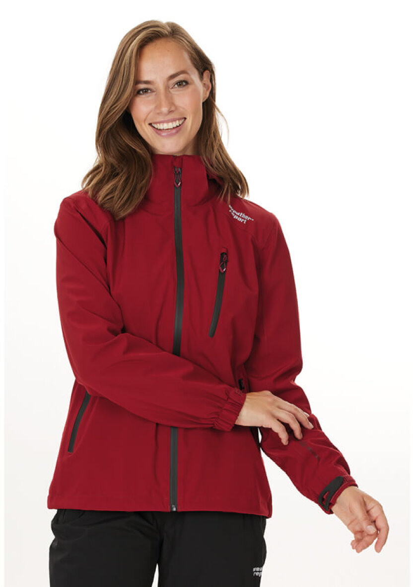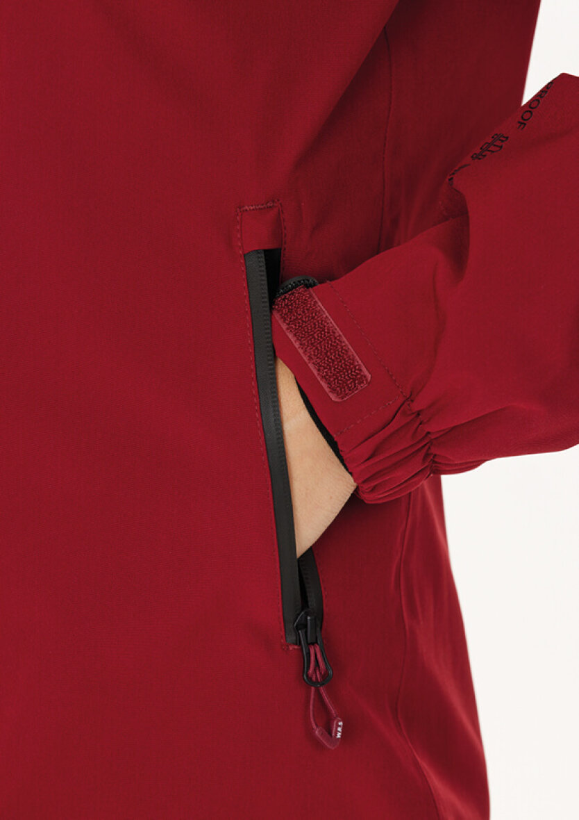 Den smarte røde Camelia regnjakke fra Weather Report er en stilfuld og praktisk regnjakke til kvinder. Den kombinerer et feminint snit med høj funktionalitet og beskytter dig effektivt mod både regn og blæst.