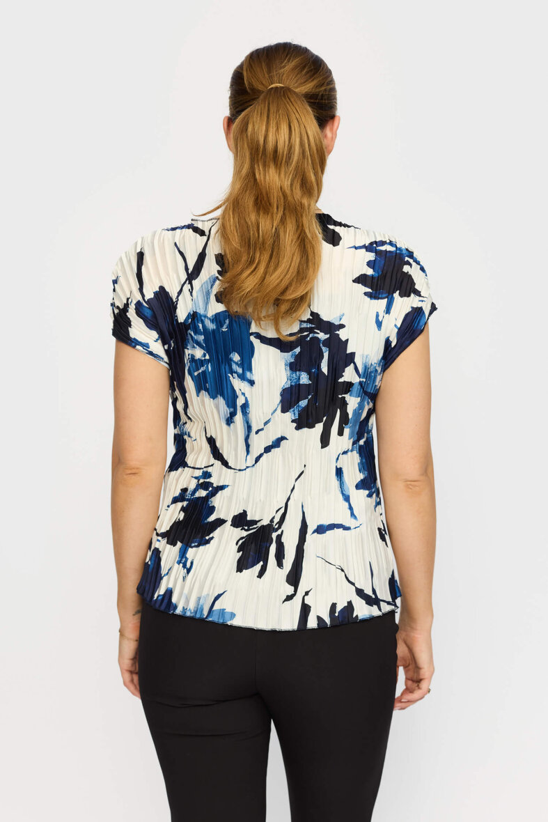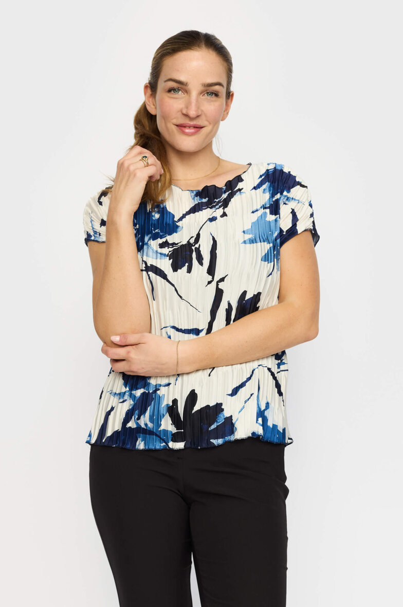 VEDA blusen fra 2-biz i det skønneste print. Den hvide bluse er lavet i et blomstret print i blå nuancer og en flot plissé effekt i stoffet.