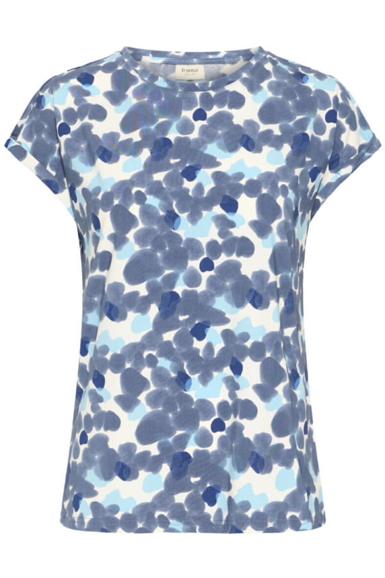 Smart hvid t-shirt fra FRANSA i et skønt grafisk print i blå nuancer.