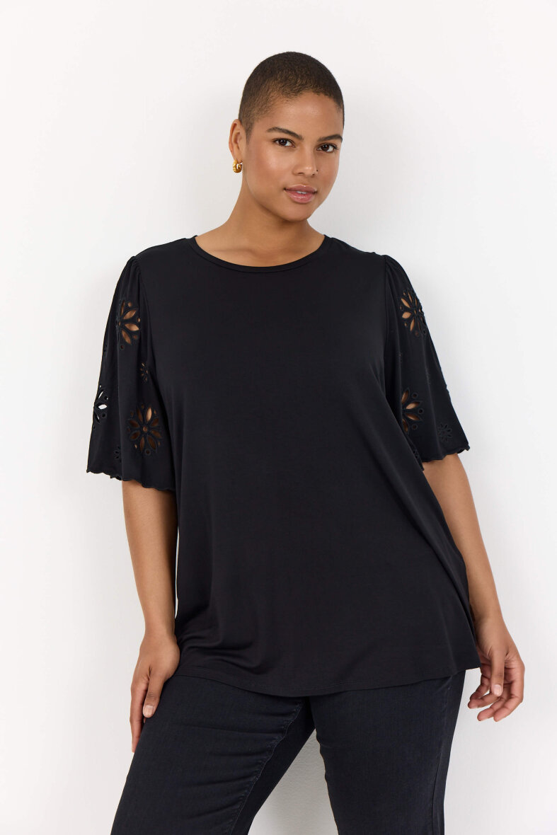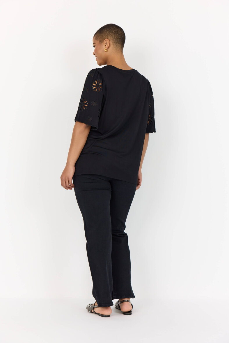 Flot sort bluse fra Wasabiconcept i modellen Stella. Blusens korte ærmer er flot dekoreret med det fineste blomster broderet hulmønster og buede kanter, som giver et feminint udtryk til blusen.