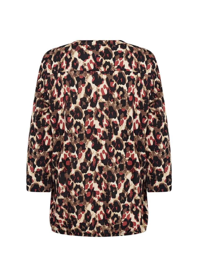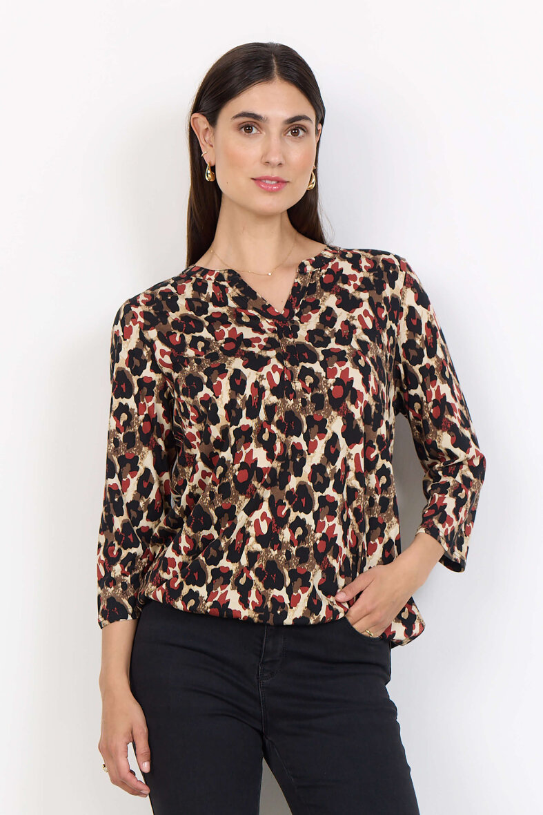 Flot Soyaconcept bluse i modellen Felicity. Blusen er lavet i et moderne leopard print i en flot farvekombination af rustrød, brun og sorte nuancer.