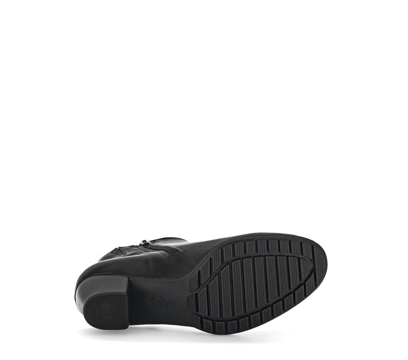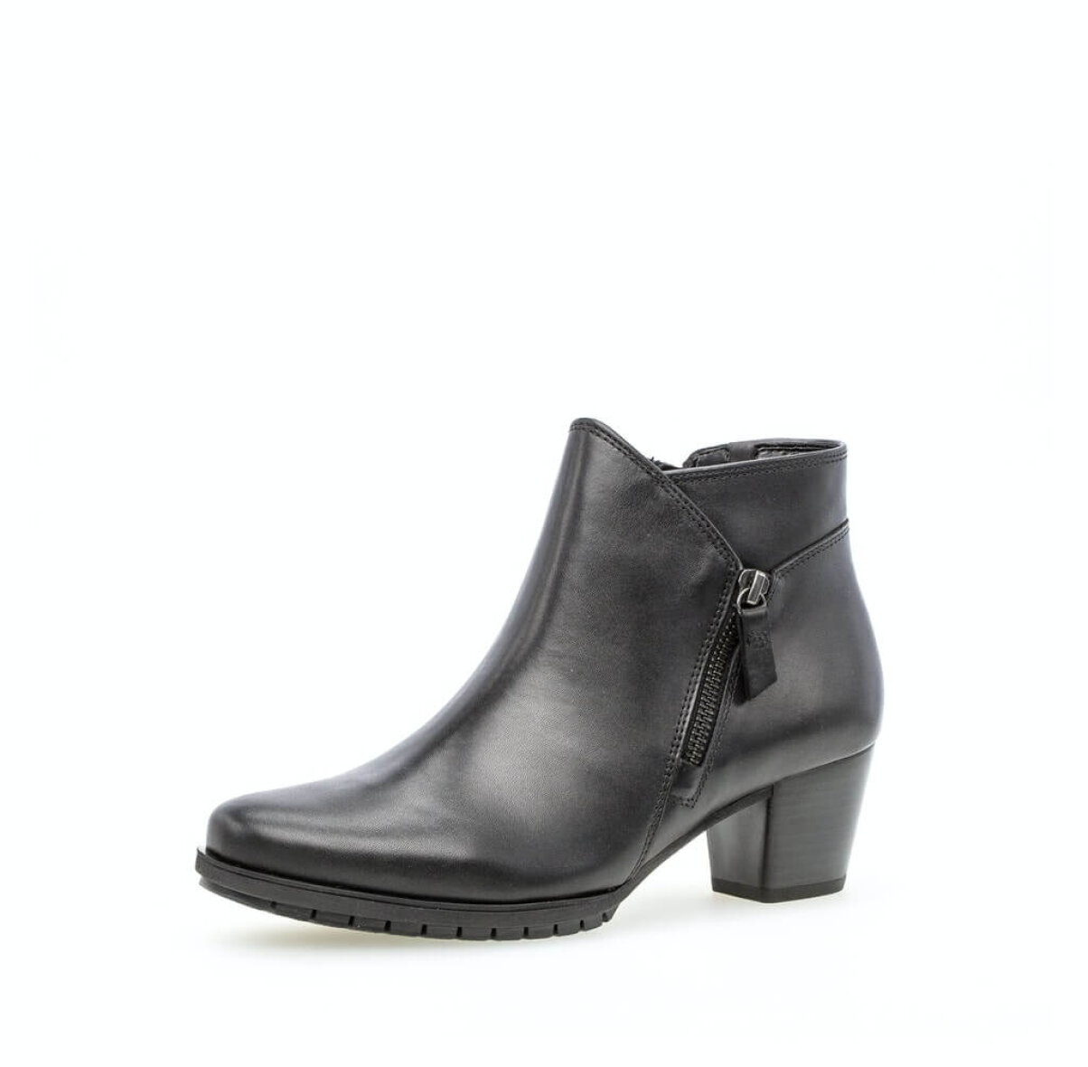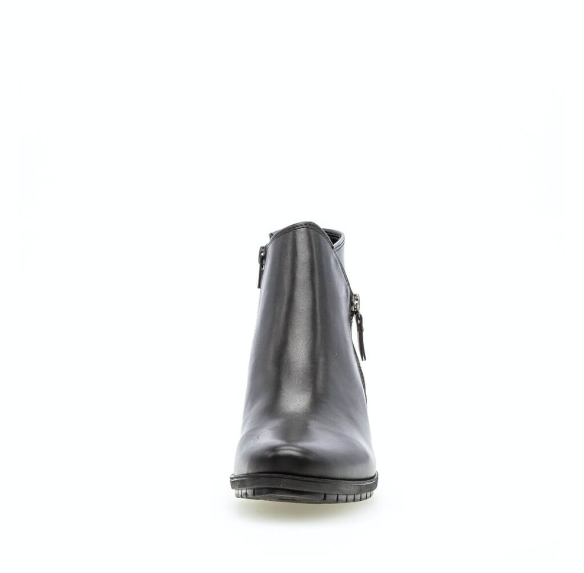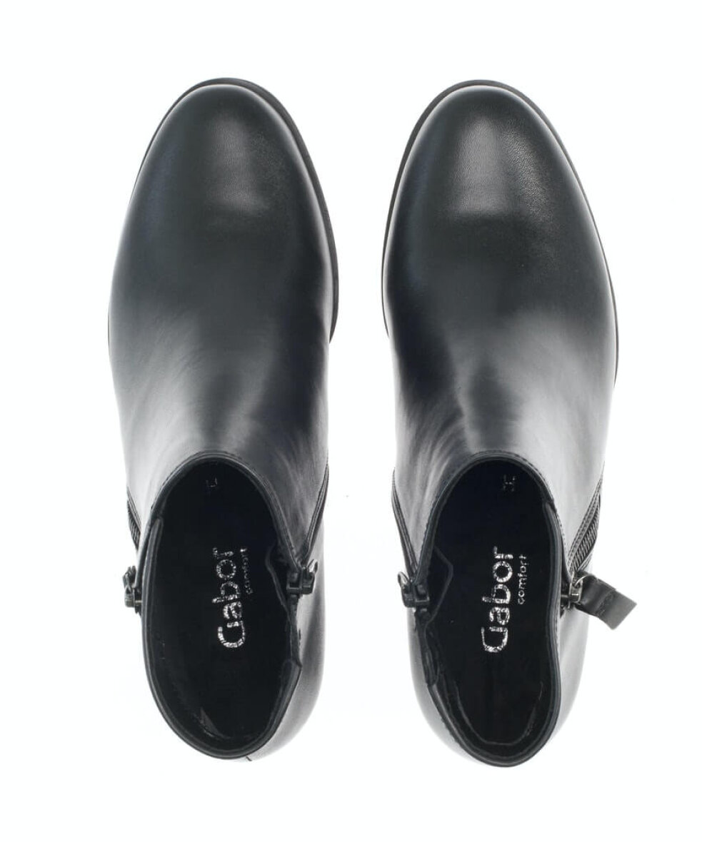 Elegant kort støvle i sort skind fra Gabor. Støvlen er lavet i et stilrent design med en dekorativ lynlås på ydersiden og en funktionel lynlås på indersiden for nem af- og påtagning.