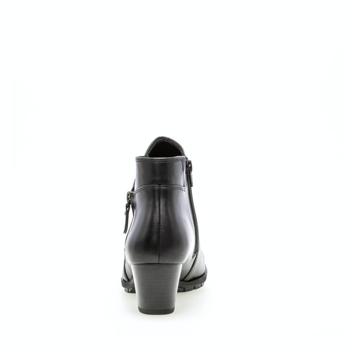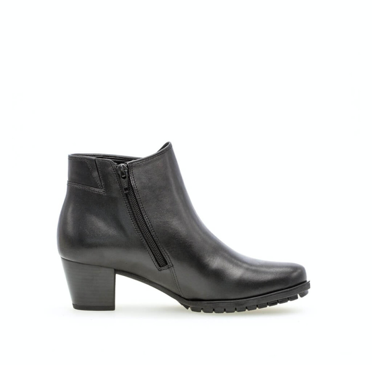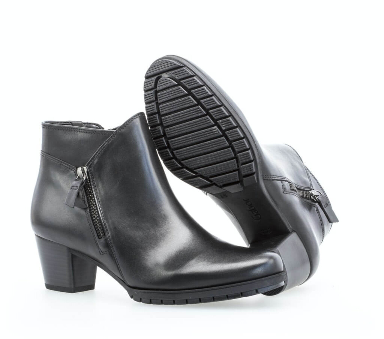 Elegant kort støvle i sort skind fra Gabor. Støvlen er lavet i et stilrent design med en dekorativ lynlås på ydersiden og en funktionel lynlås på indersiden for nem af- og påtagning.