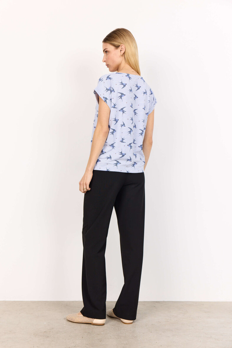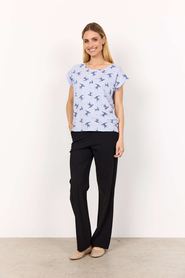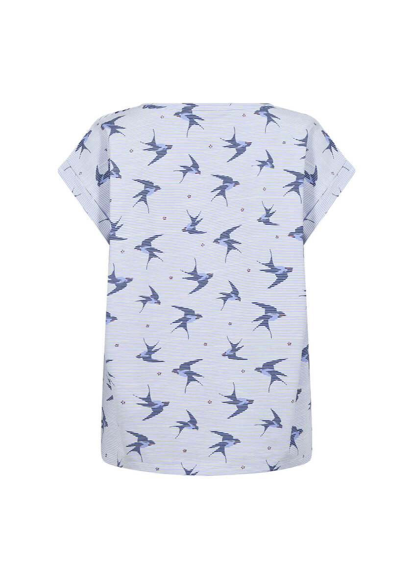 Flot t-shirt fra Soyaconcept. T-shirten er lavet i et diskret stribet design med lyseblå striber og et flot fugle print med svaler all-over samt små mørke røde blomster.