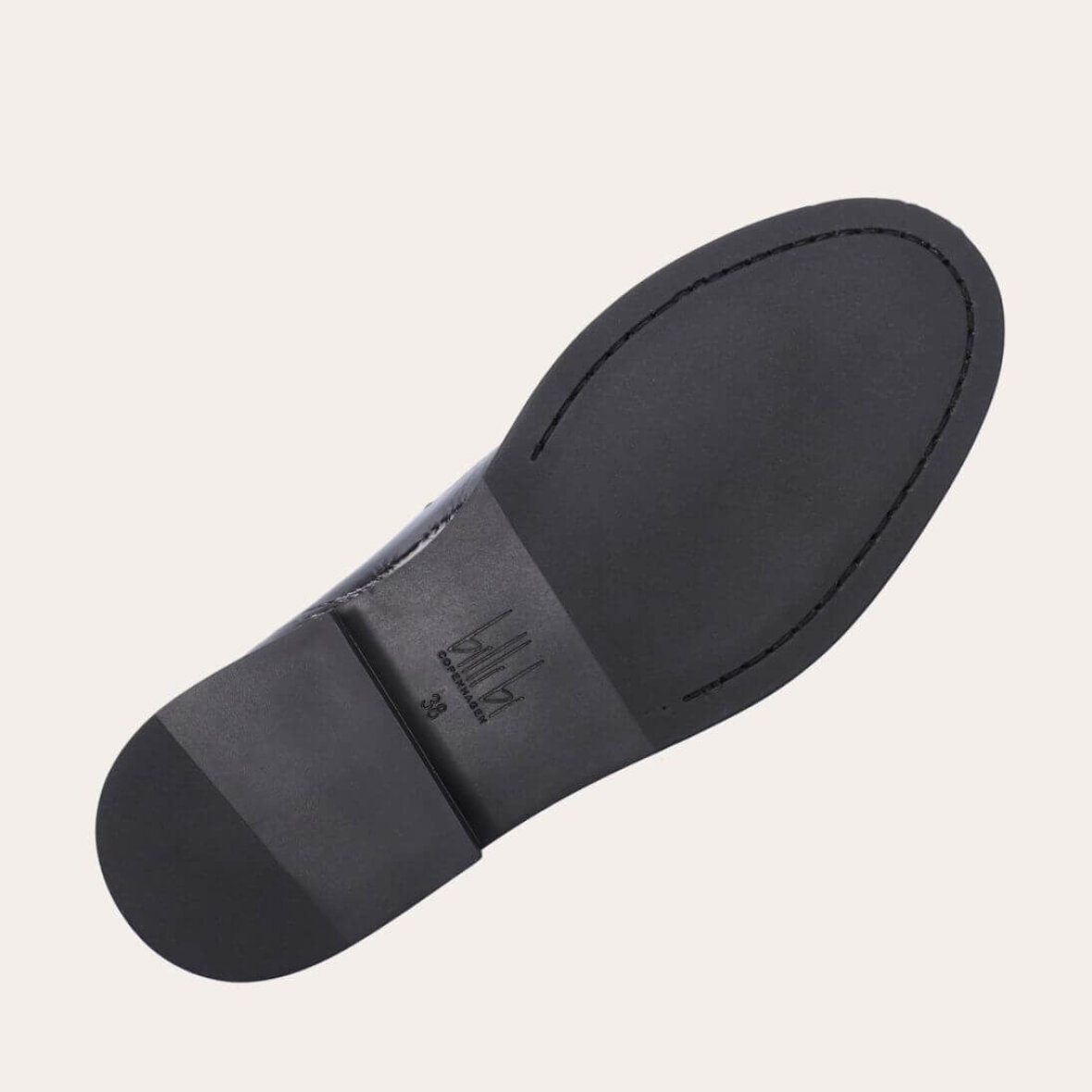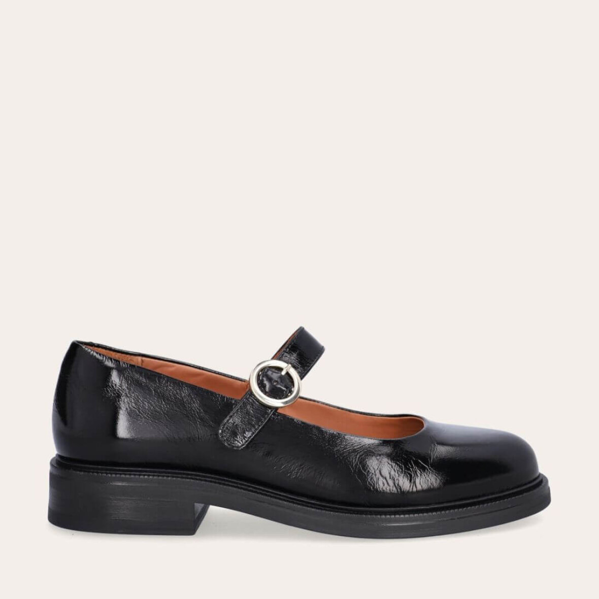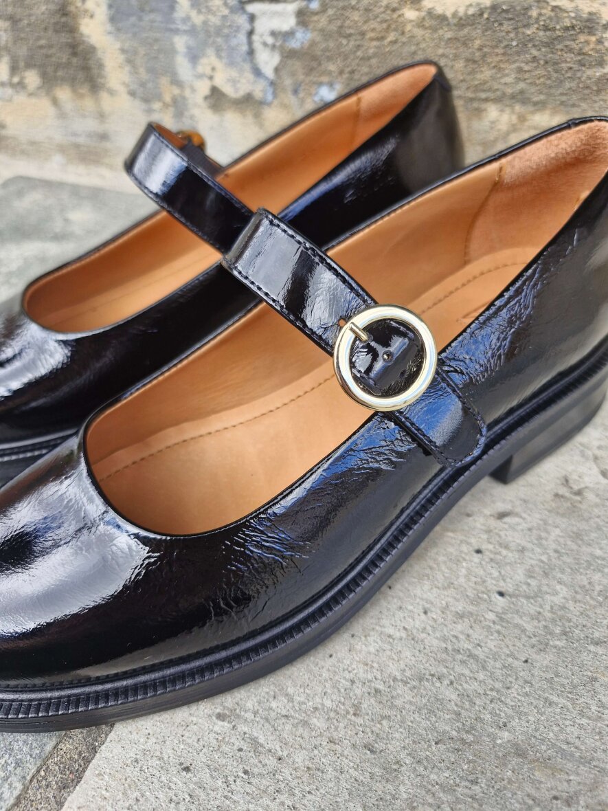 Skoen er udført i sort lakeret skind med shine effekt og rund snude. Skoen er med en strop over fronten, som lukkes med spændeluk.