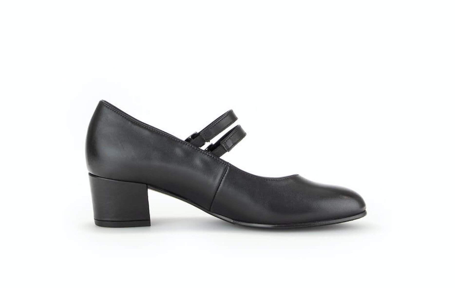 Gabor pumps i et elegant og tidløst design, som kan bruges til enhver festlig anledning. Den højhælede sko er udført i glat sort skind med med to spænderemme over vristen.