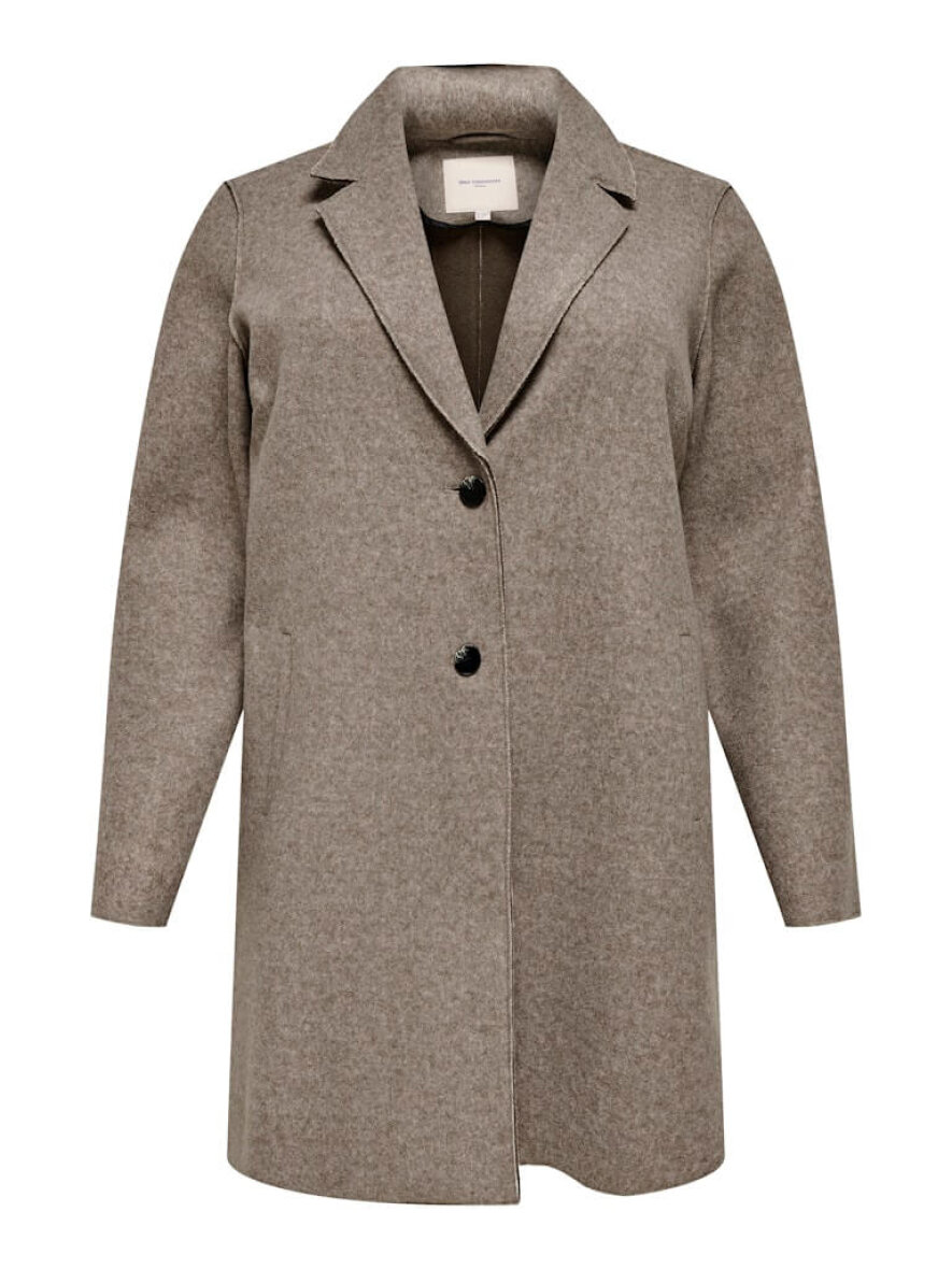 Carcarrie jakke / frakke fra ONLY Carmakoma. En skøn lang jakke i en flot mørksand farve, som matcher sæsonens farver.