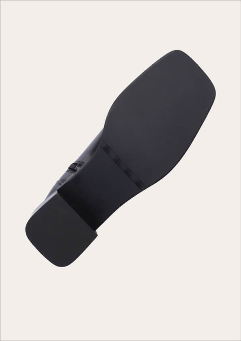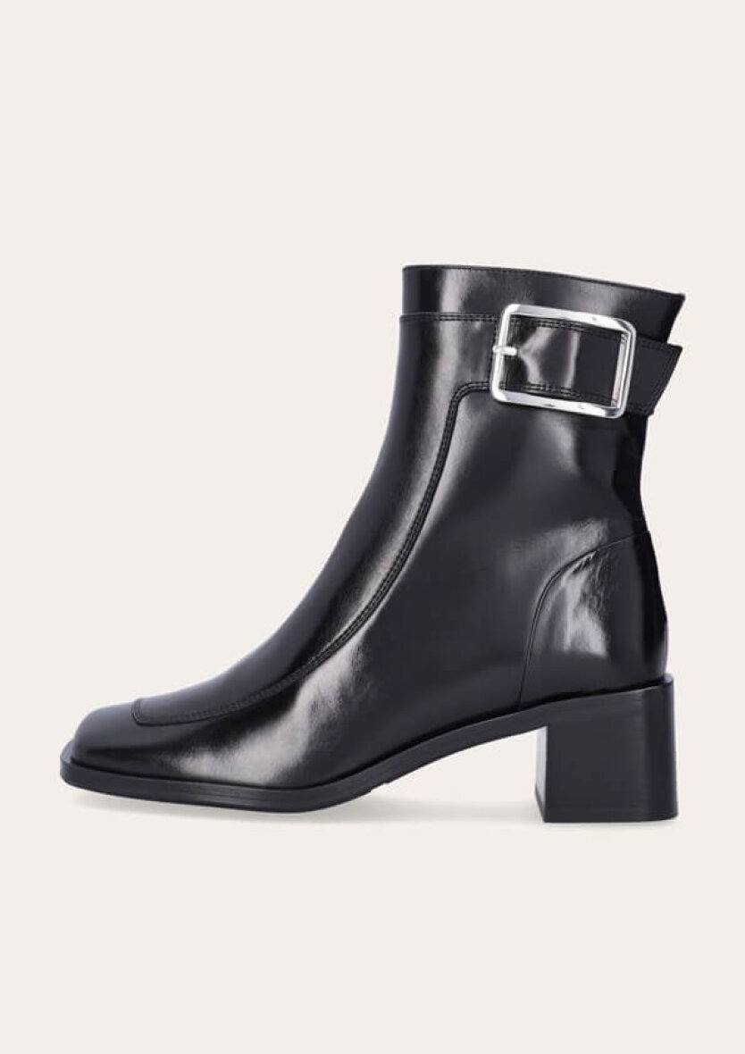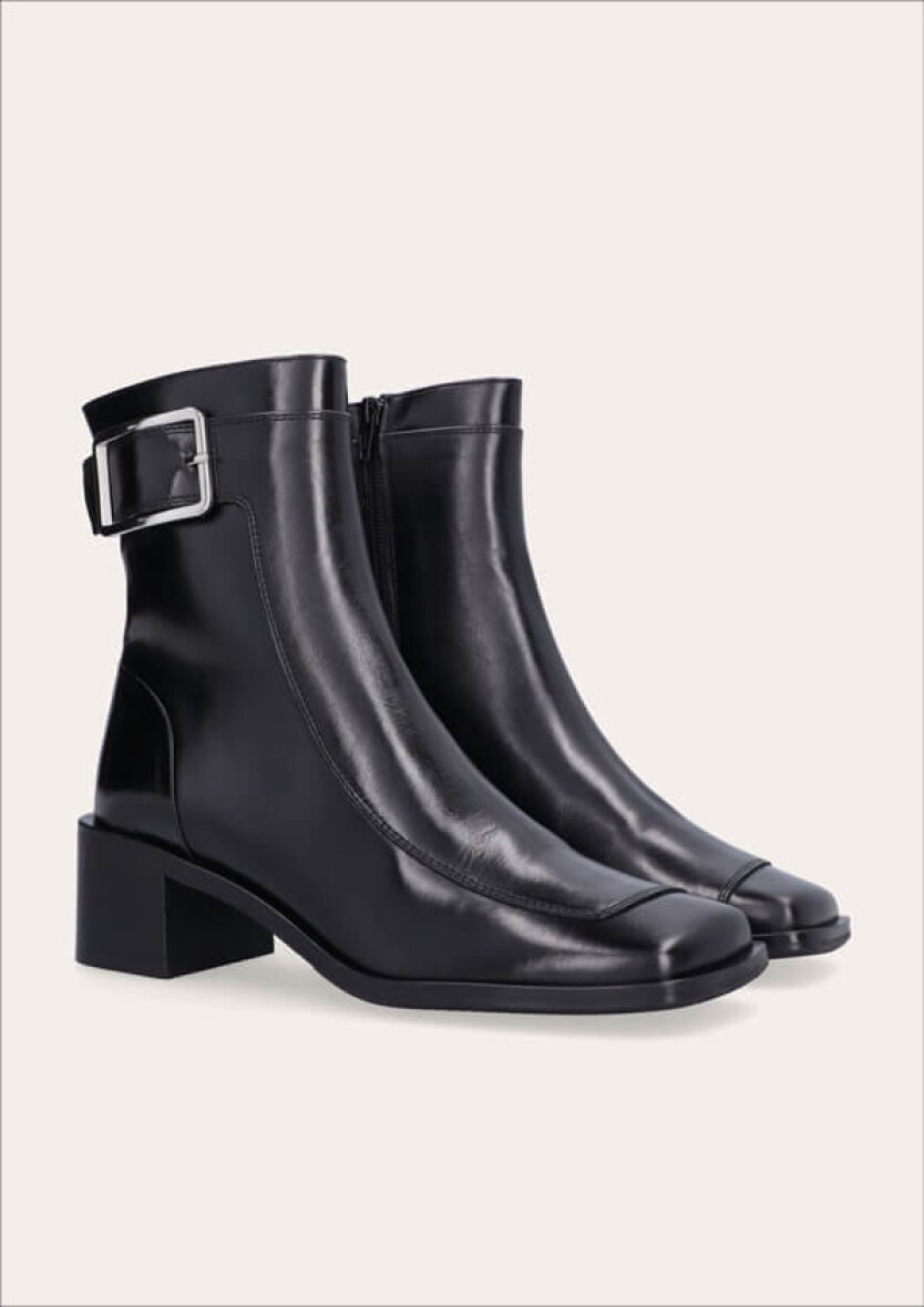 Den håndlavede støvle er udført i sort, glat skind med firkantet tå og 5 cm blokhæl. Det store sølvspænde på ydersiden giver et eksklusivt udtryk, mens den synlige sømlinje tilføjer kant.