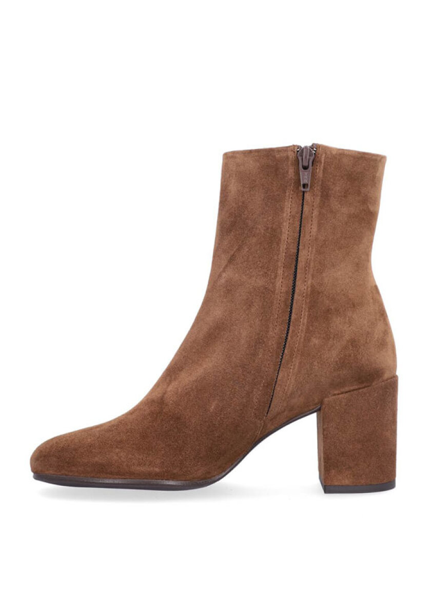 Den håndlavede støvle er udført i brun ruskind med rund snude og 6 cm ruskindsbeklædt blokhæl. Støvlen er med en fin overskærings detalje på ydersiden, hvilket giver et enkelt og elegant design.