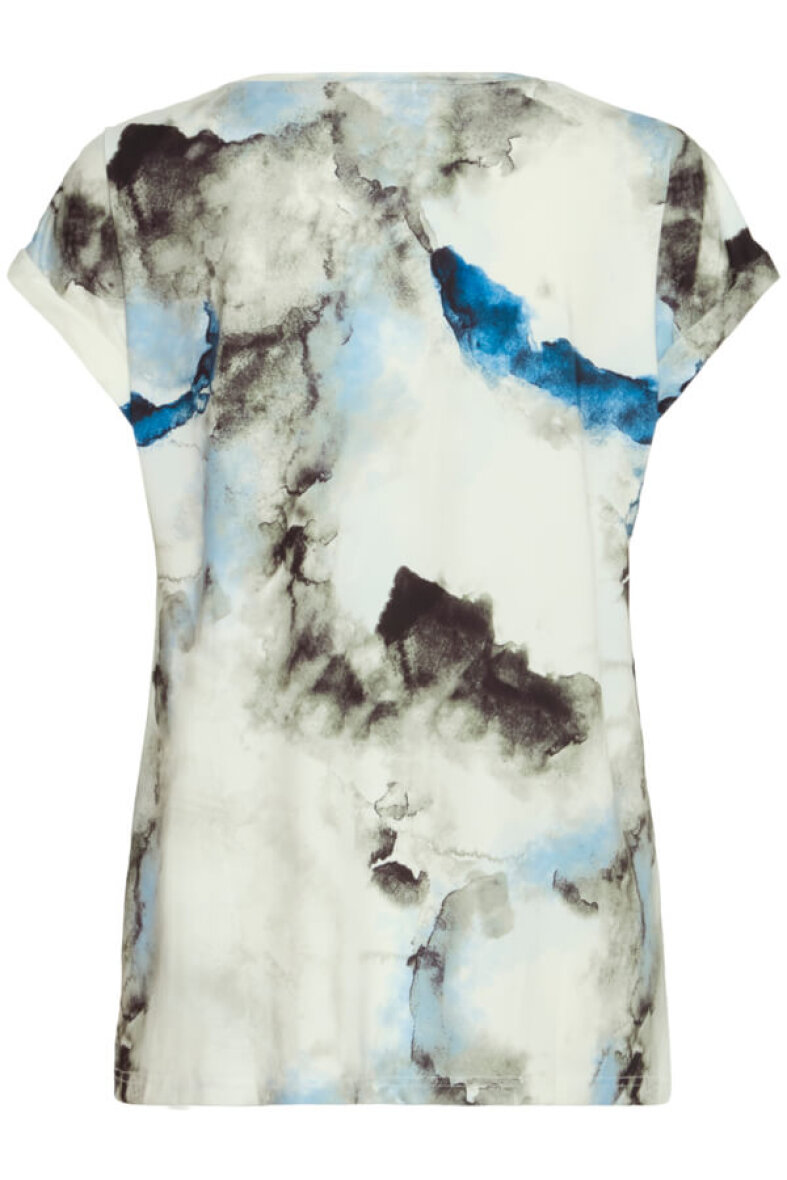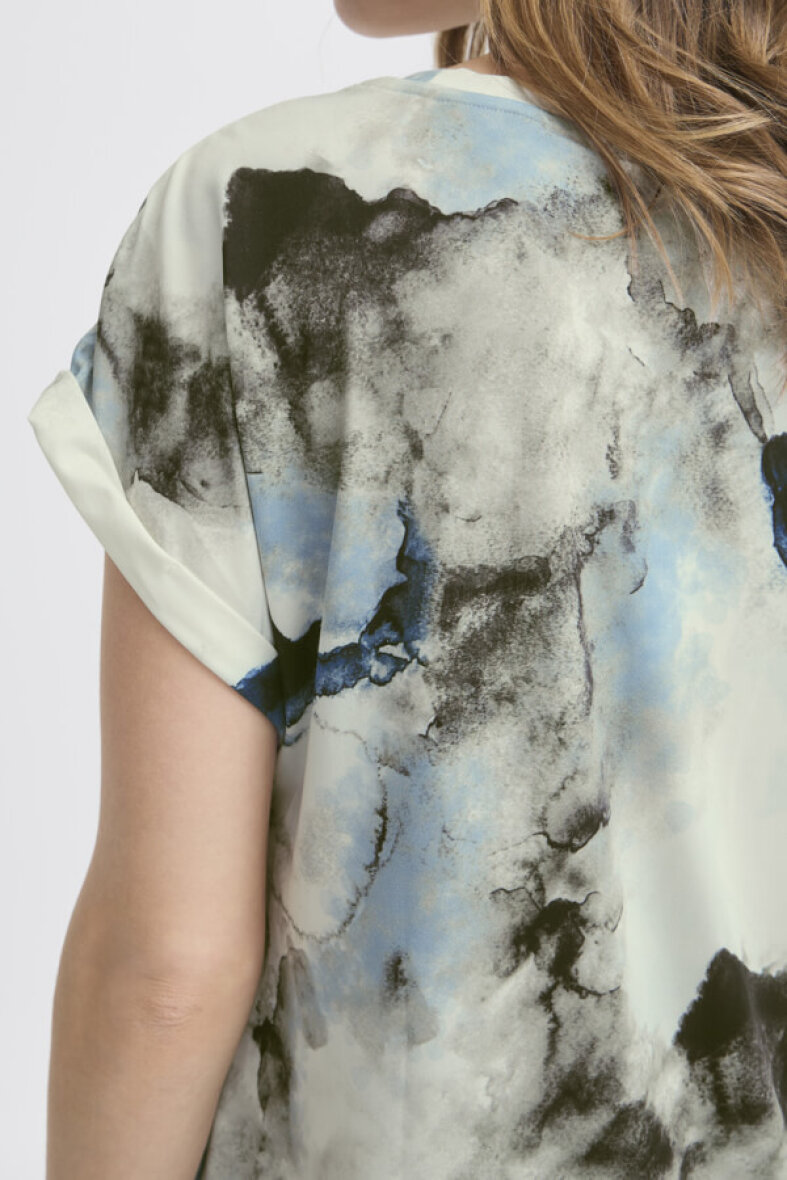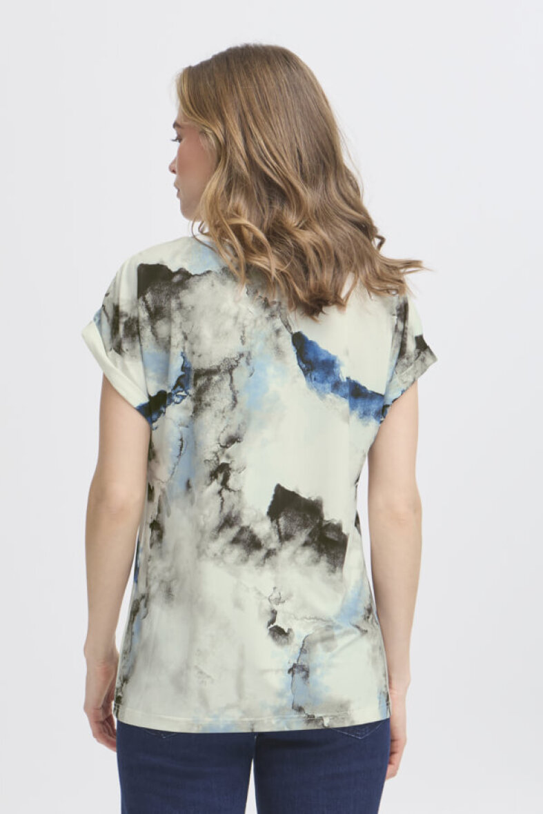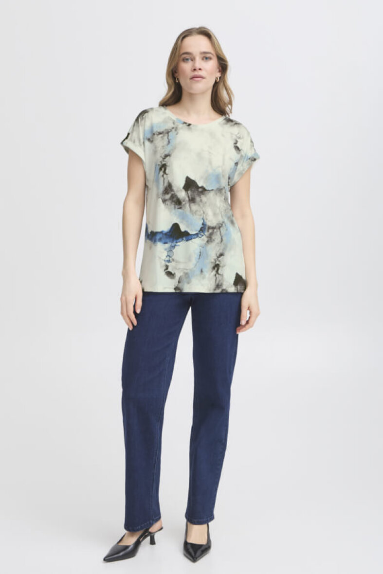 Smart lys t-shirt fra FRANSA i et skønt grafisk print i oliven grønne nuancer.