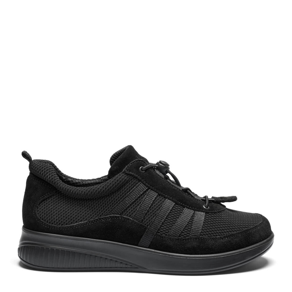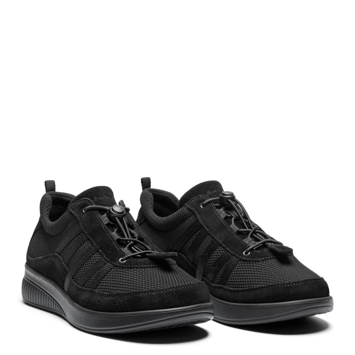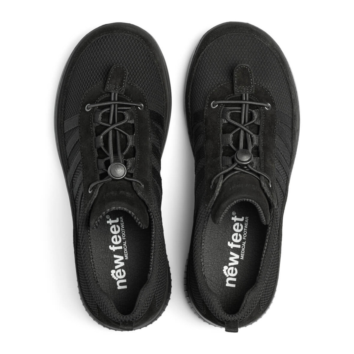 Komfortable sorte sneakers fra New Feet - Perfekt som hverdagsfortøj, da skoen er udstyret med vandafvisende membran. Skoen er lavet med en sort mest kvalitet på overdelen med stribet detaljer på siderne, hvilket er med til at give skoen et sporty udtryk.