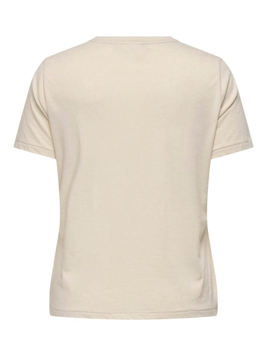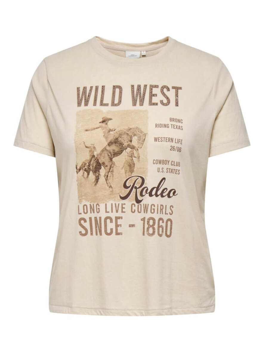 Sandfarvet t-shirt fra Only Carmakoma. T-shirten er med western tema med tryk på fronten. T-shirtens similisten og struktur i tryk på fronten, giver et flot spil i designet.
