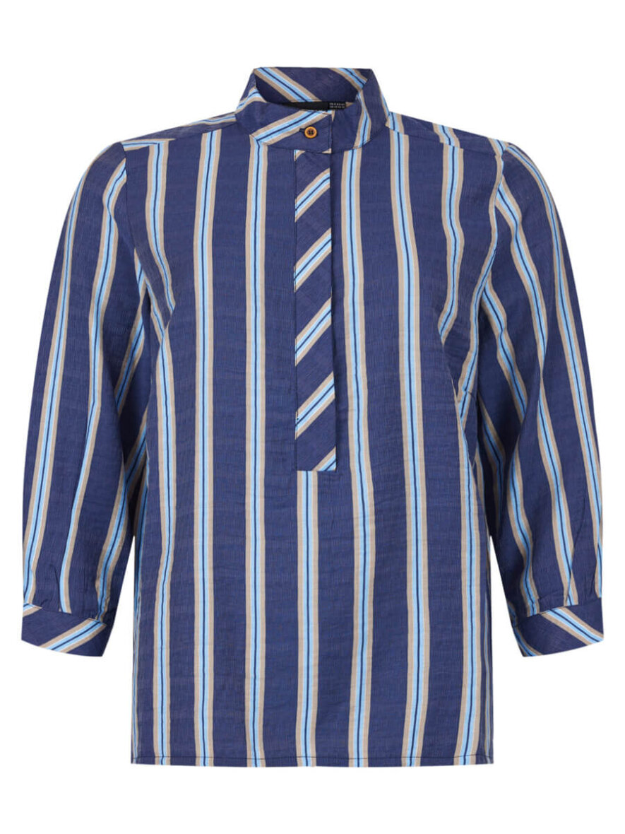 Skjorten er med rund høj hals med knapluk og stolpeluk. Knapperne på fronten er skjult med en påsyet stofkant, hvilket giver et stilrent look.