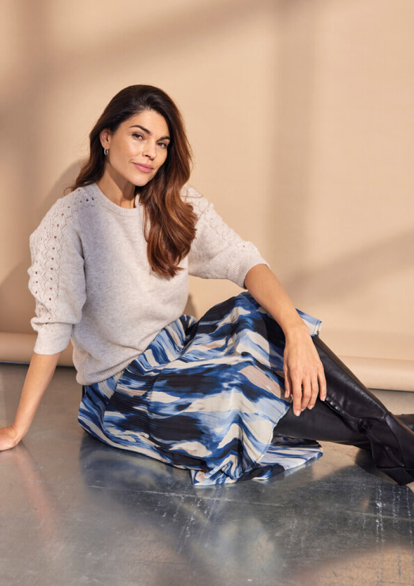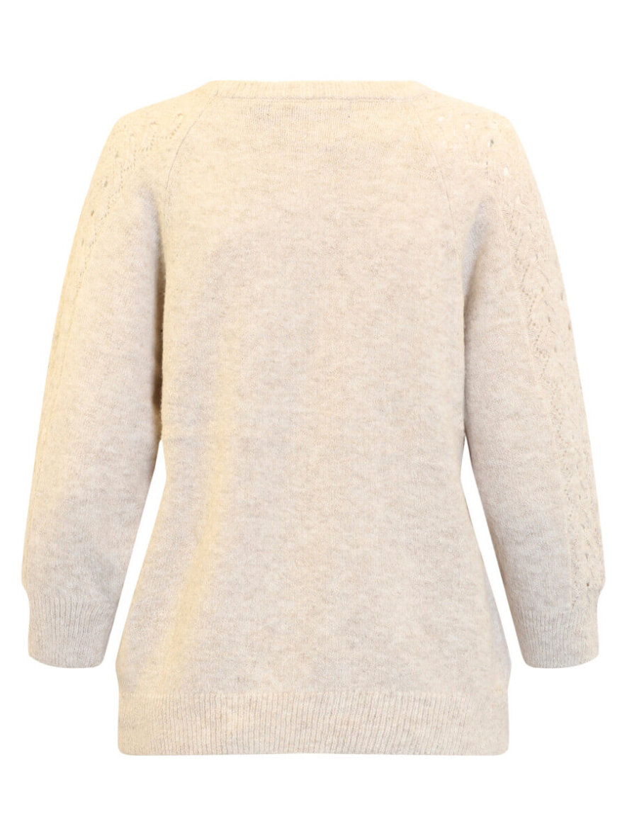 Trøjens ærmer er med et flot vævet mønster og hullet design, som giver et feminint touch til designet.