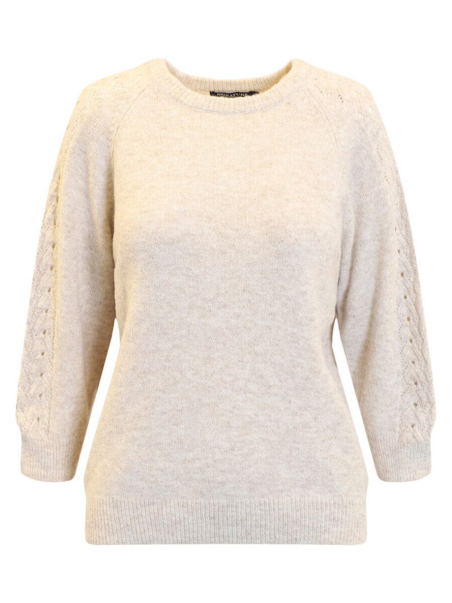 Signature strik trøje i en fin lys sandfarve. Strikken er med rund hals og 3/4 lange ærmer med ribbet kant ved alle åbninger.