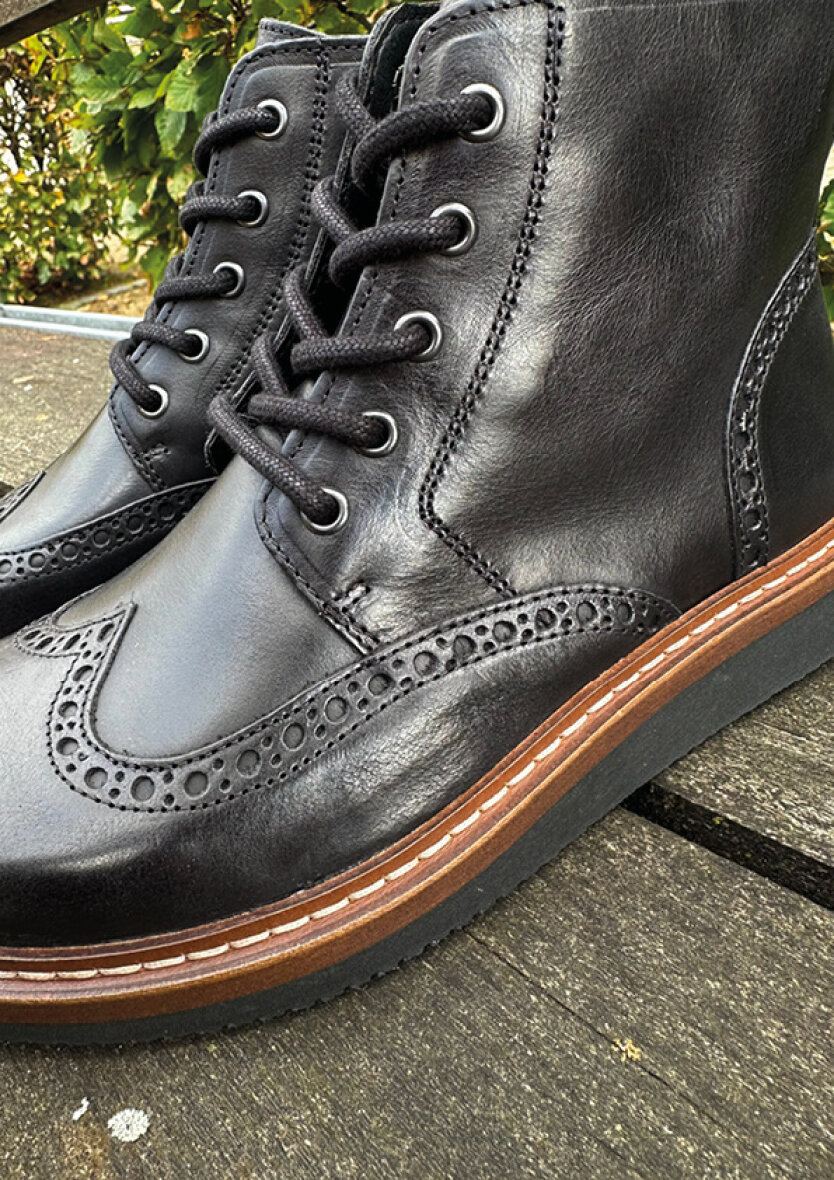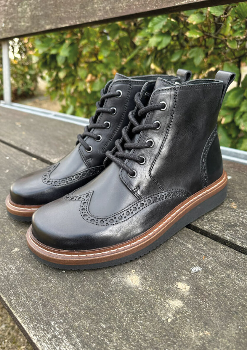 Nature Footwear støvler i modellen Signe. Sort og moderne snørestøvle med klassiske detaljer og et elegant brogue-mønster. Støvlen har lynlås på indersiden, som gør den nem at tage af og på