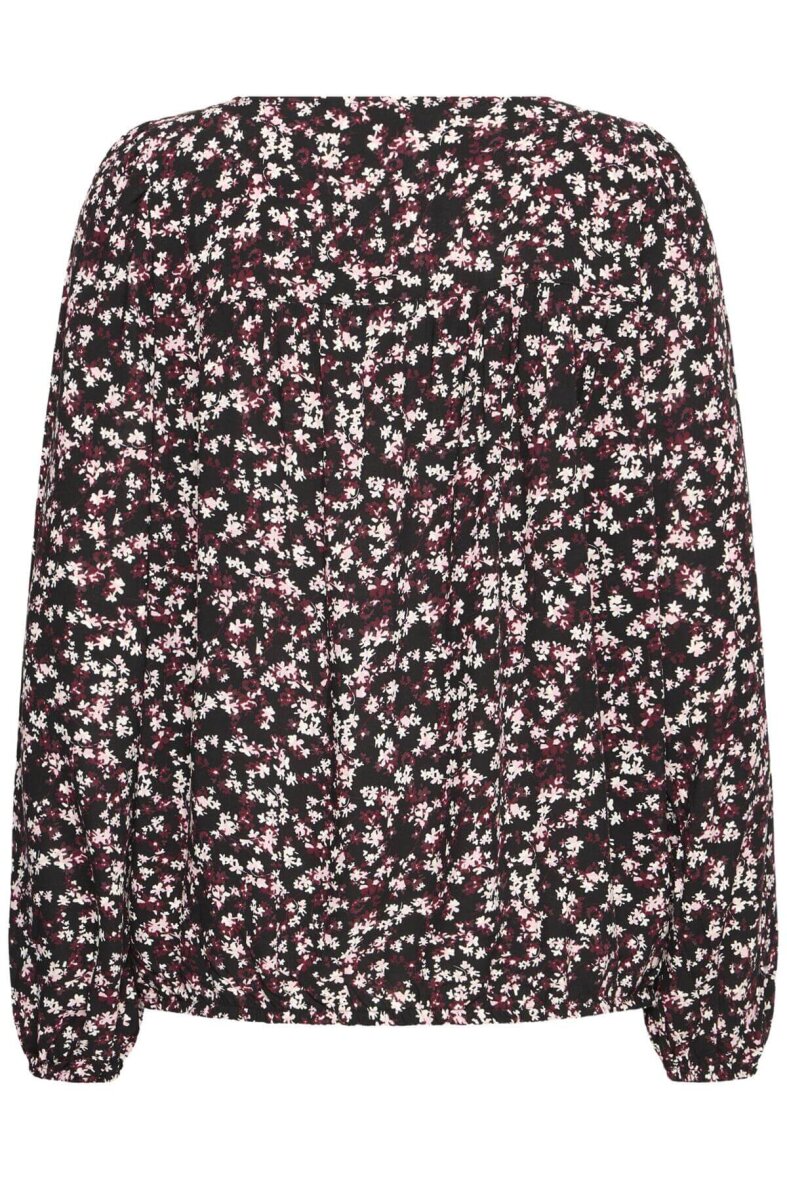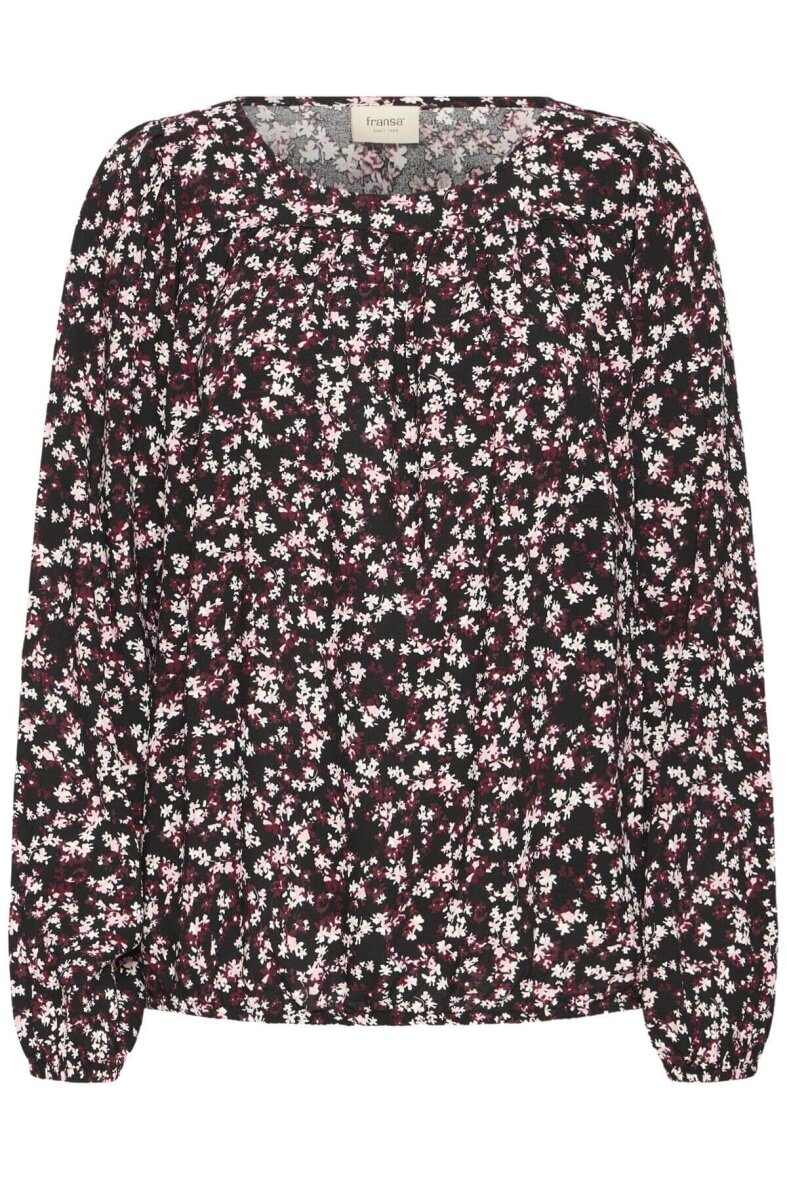 FRANSA bluse i modellen Kiki. Den sorte bluse er i et skønt blomstret print i rød og rosa mix af blomster.
