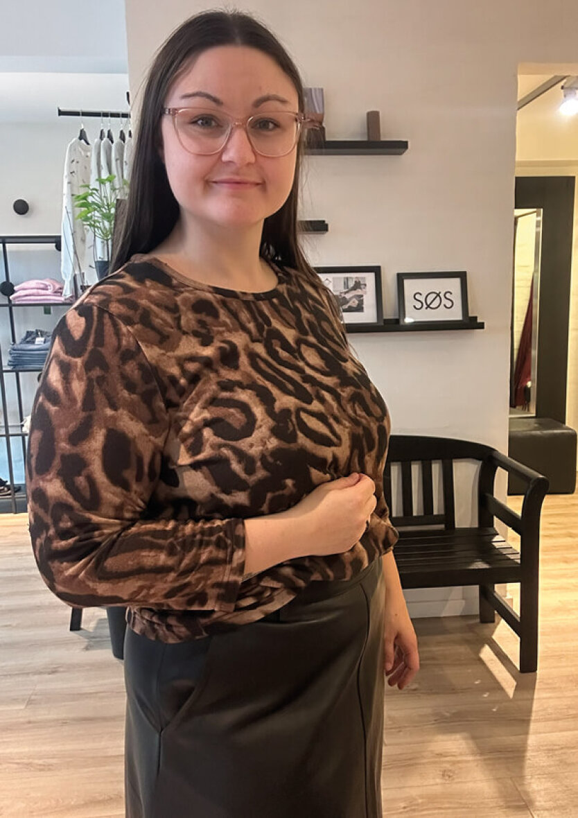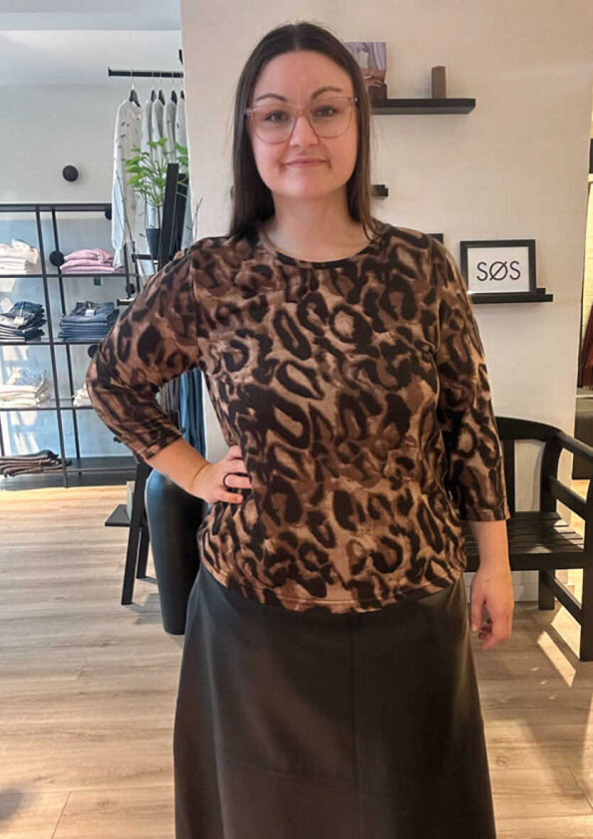 Signature bluse i et moderne leopard print i brune og sorte nuancer. Blusen er med rund hals og 3/4 lange ærmer.