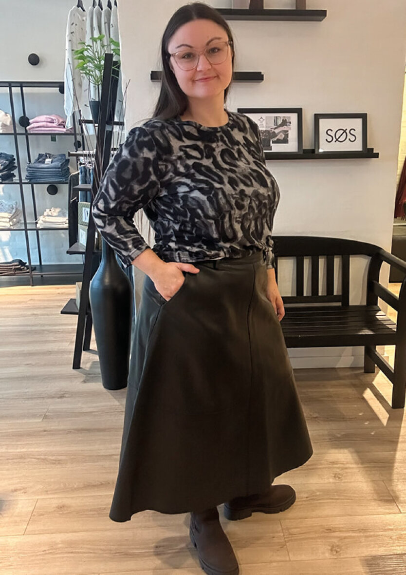 Signature bluse i et moderne leopard print i grå og sorte nuancer. Blusen er med rund hals og 3/4 lange ærmer.