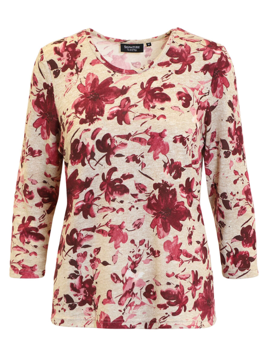 Signature sandfarvet bluse i et skønt blomstret print i vinrøde og rosa nuancer.