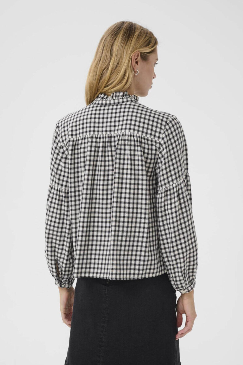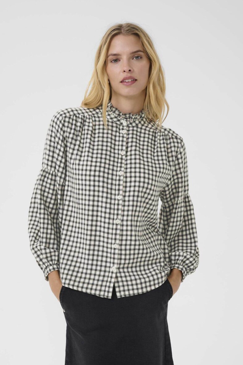 Skjorten er med rund hals med kina krave i små flæser, hvilket giver et feminint touch til skjorten. Skjorten Samilla er med lange ærmer med knapluk og en fin overskæring på midten, hvilket giver flot spil i designet. Med gennemgående knapper langs fronten, så man kan bestemme og man vil bære skjorten lukket eller åbentstående.