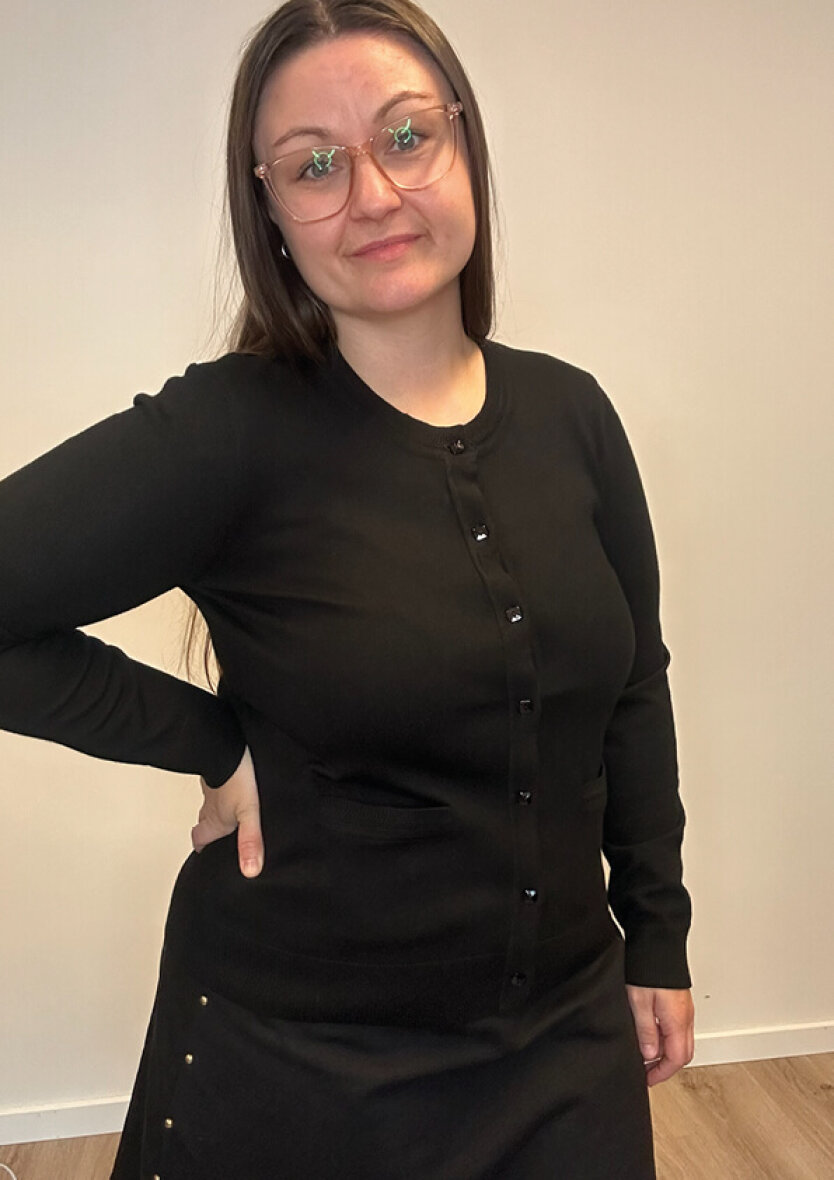 Brandtex cardigan i sort er et klassisk og alsidigt stykke tøj, som passer ind i enhver garderobe. Den enkle farve gør den let at kombinere med både formelle og afslappede outfits. En cardigan kan bæres over en skjorte for et pænt og professionelt look, eller over en T-shirt for et mere afslappet udtryk.