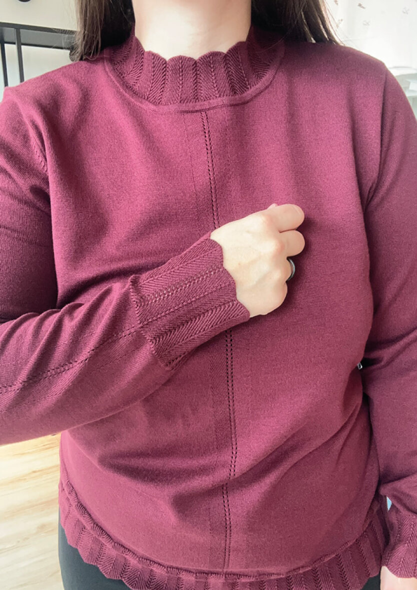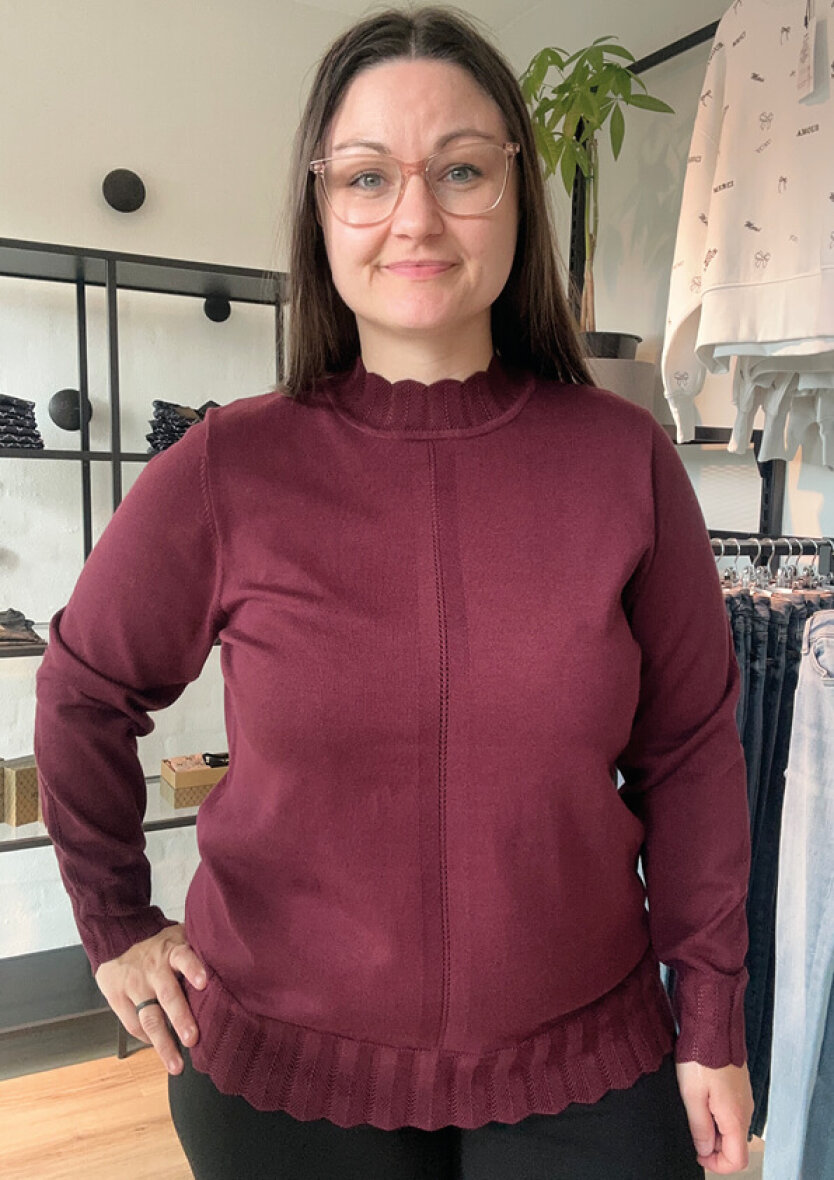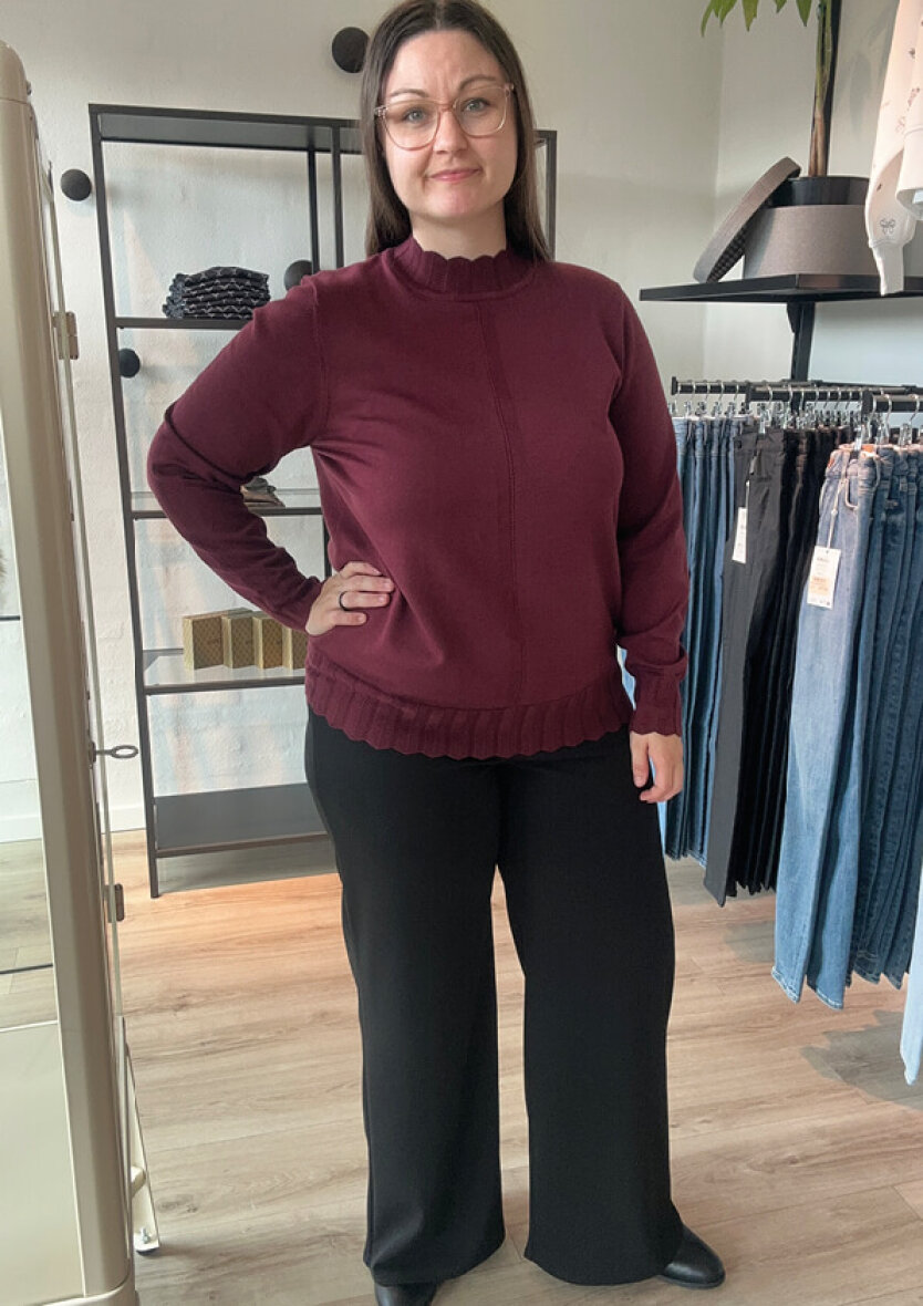 Signature striktrøje i en fint strikket kvalitet og moderne vinrød farve. Strikken er med høj hals med et flot vævet mønster og buede kanter langs halsåbningen. Det flotte mønster går igen ved håndleddet og bunden på trøjen og skaber struktur og et feminint touch.