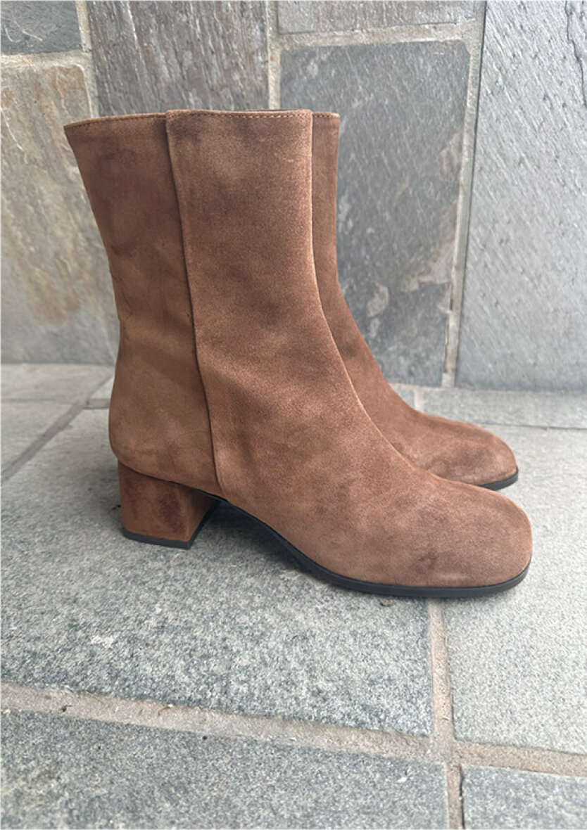 Den håndlavede billi bi støvle er udført i brun ruskind med firkantet snude og 5 cm ruskindsbeklædt blokhæl. Støvlen er med en fin overskærings detalje på ydersiden, hvilket giver et enkelt og elegant design.