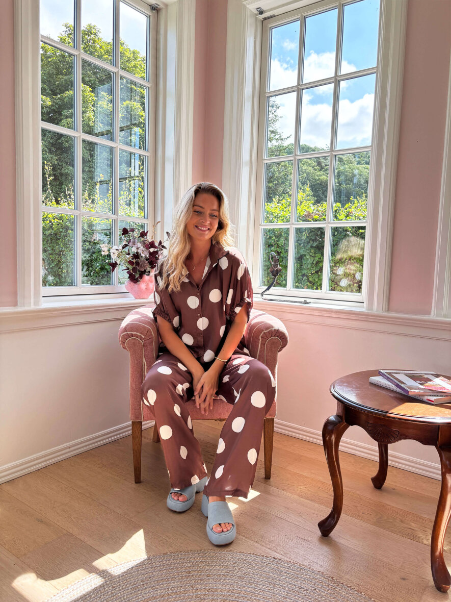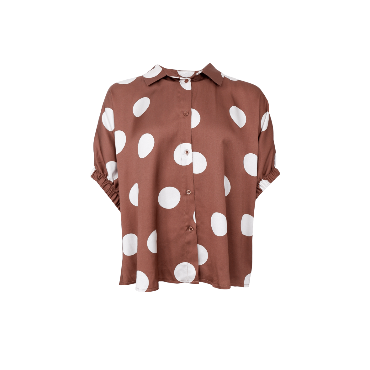 Black Colour brun bluse i et moderne prikket design i hvide prikker. Blusen er lavet i en silkeblød 100% viskose kvalitet.