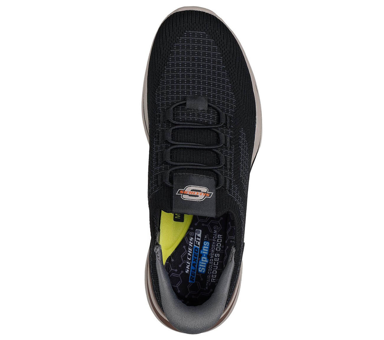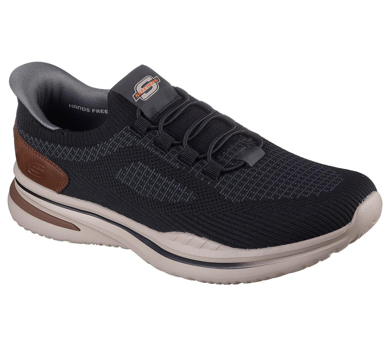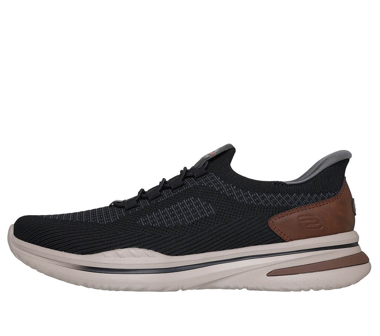 Skechers herre sneakers i modellen Relaxed Fit: Norlan - Alonso. Skoen er lavet i en alsidig sort farve med brun hæl og lys grå farvet bund, så den passer til overdelens mørke design.