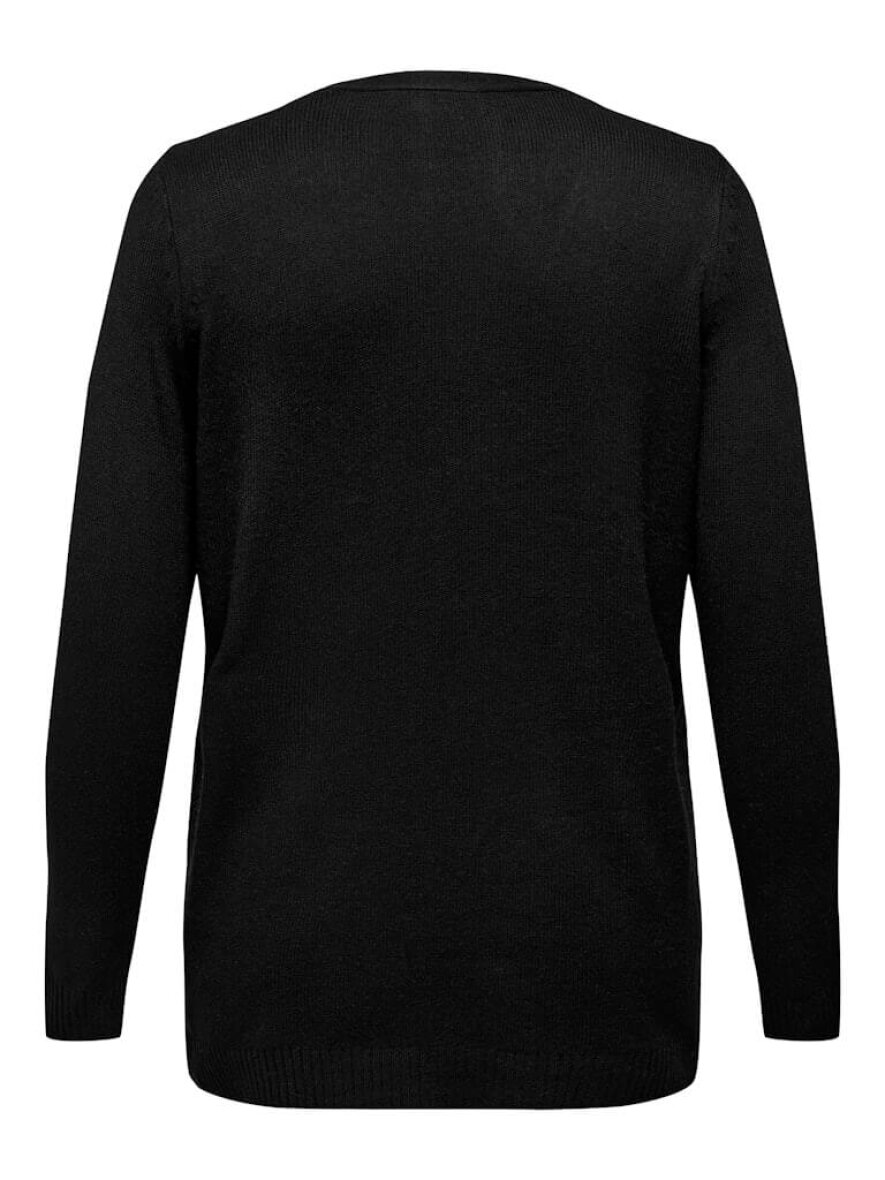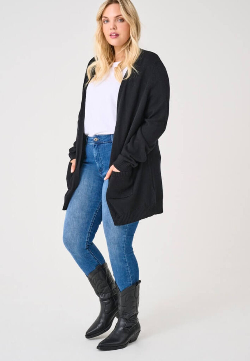 Lækker blød strik cardigan fra ONLY Carmakoma. Cardiganen er i en klassisk sort farve - et uundværligt item i enhver garderobe. Tidløs, alsidig og altid elegant – den åbne sorte cardigan passer til alt og kan styles på utallige måder.
