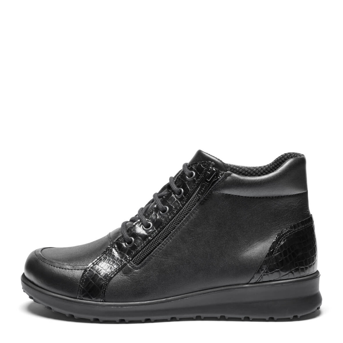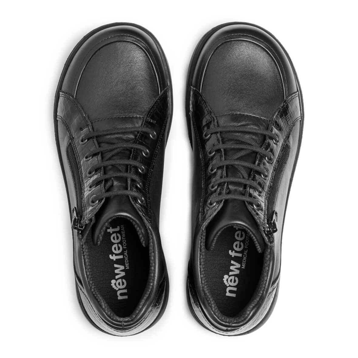New Feet ankelstøvle i en flot sort skind kvalitet med fine lakeret detaljer på hælen og fronten, hvilket er med til at give et fint og moderne udtryk. Støvlen er med Orthostretch på snuden, hvilket giver en blød og elastisk overdel og er ideel til evt. hammertæer.