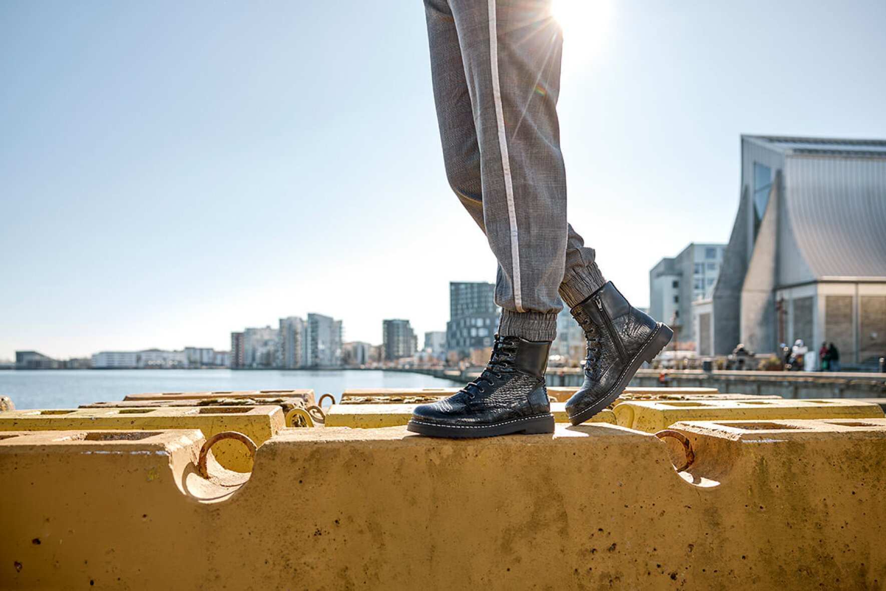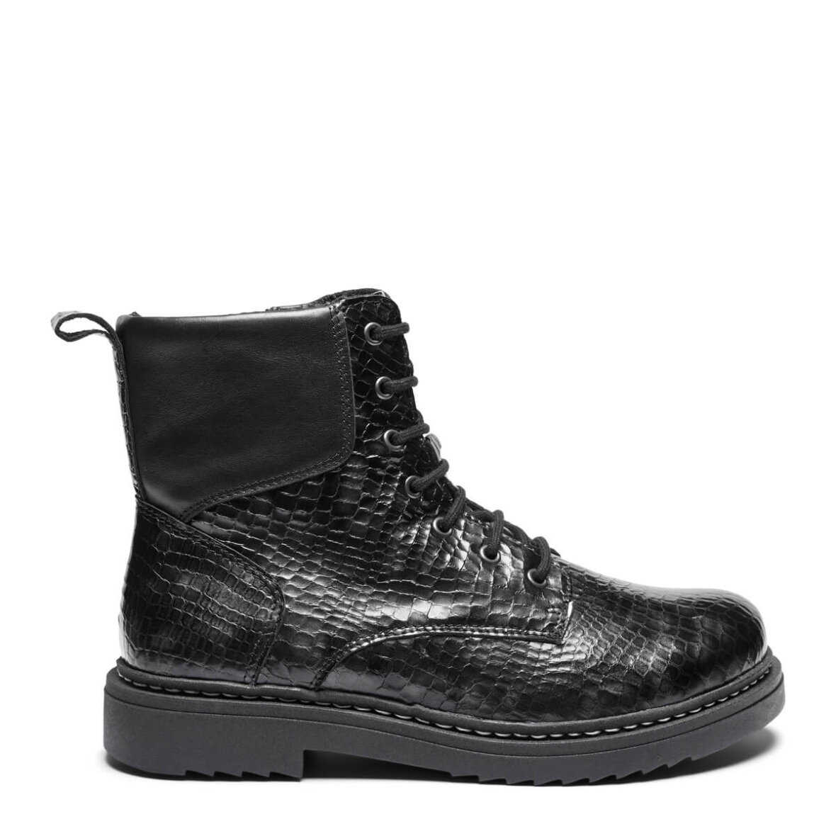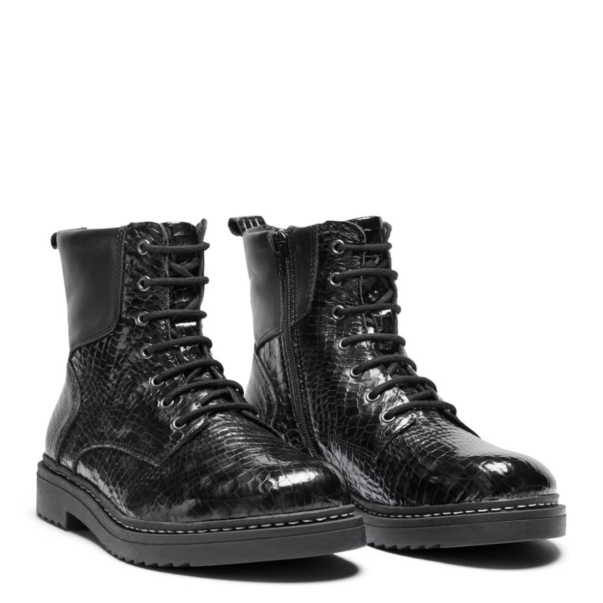 Støvlen reguleres med snøreluk og lukkes lynlås på indersiden, hvilket gør støvlen nem at få af og på.