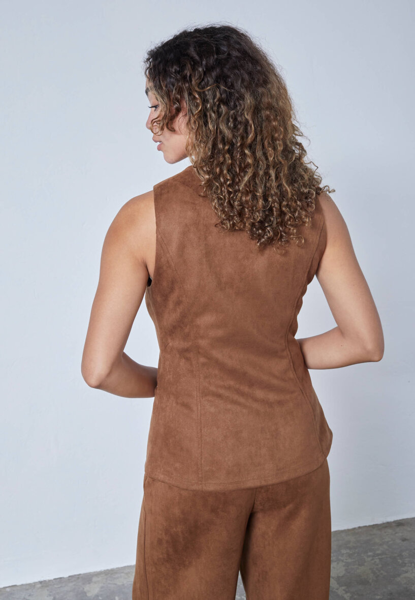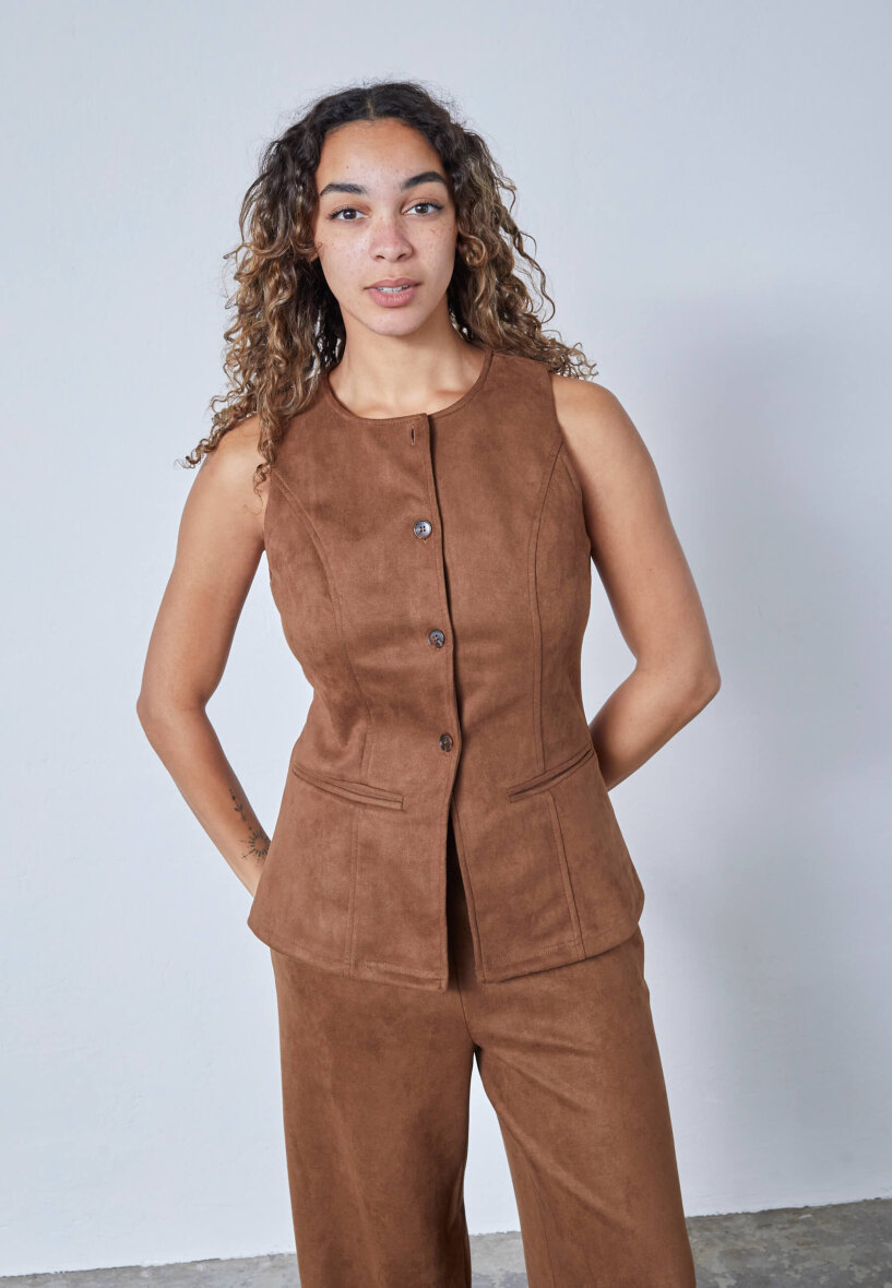 Sisters Point ærmeløs vest i modellen VELRA-VE. Vesten er lavet i en skøn brun cognac farve i en lækker blød ruskindslignende materiale, hvilket giver et stilfuldt look.