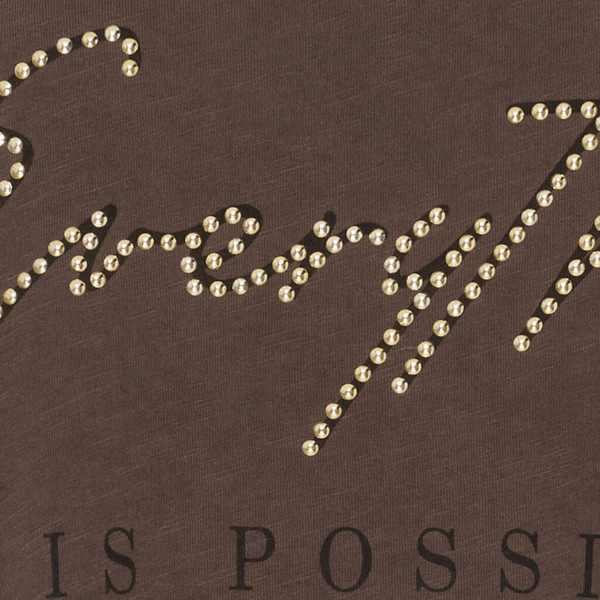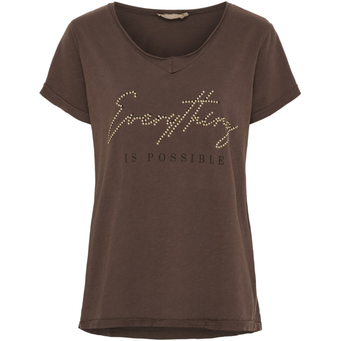På fronten er t-shirten med tryk af teksten " Everything is possible" med nitter det ene ord.