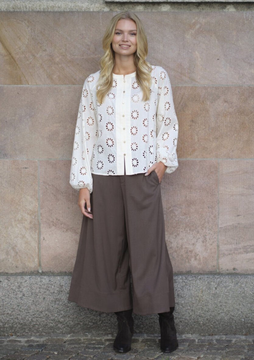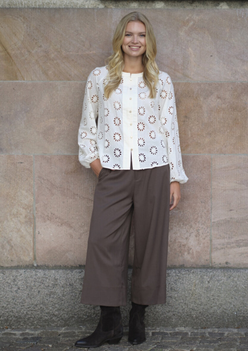 Blusen er lavet i det smukkeste blomsterbroderet hulmønster på fronten, som skaber et let og feminint udtryk, mens den ensfarvede ryg uden hulmønster tilføjer en rolig og stilren kontrast.