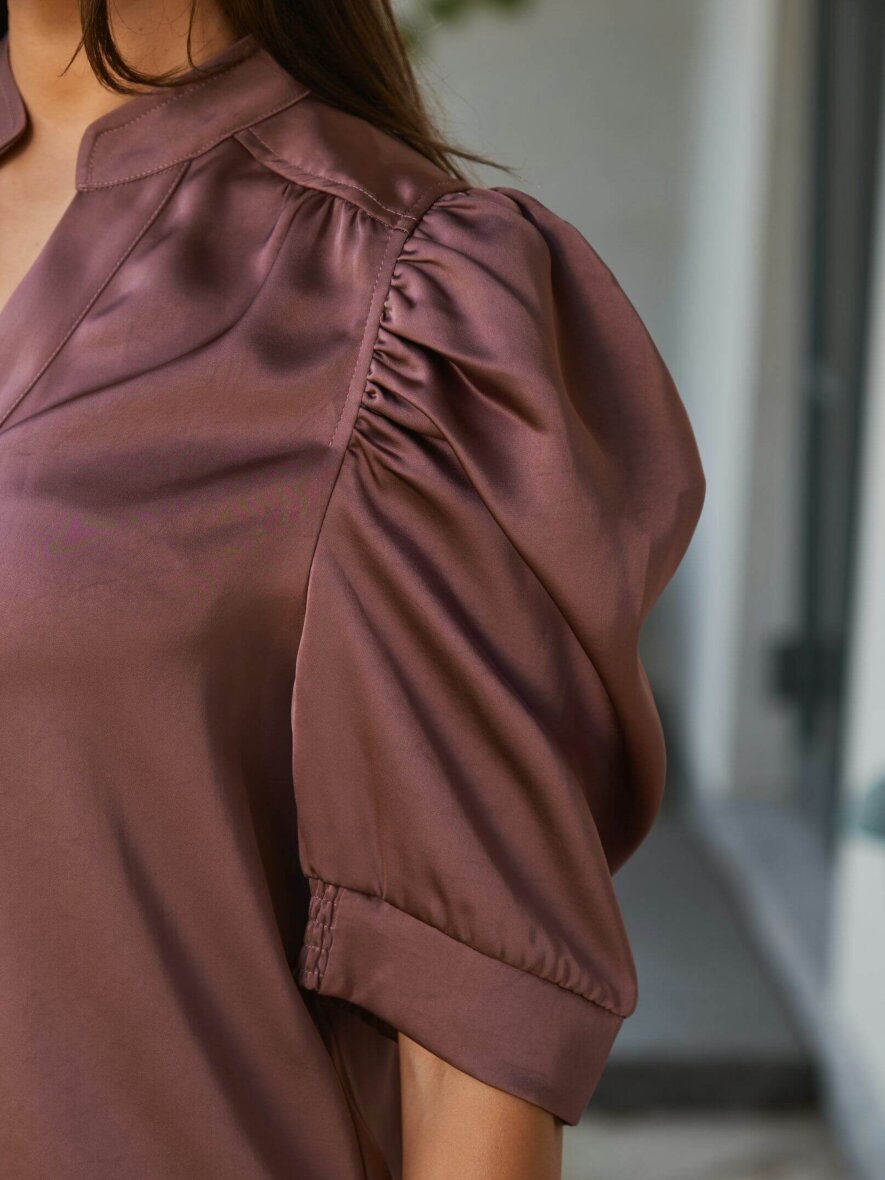 Blusen er med v-halsudskæring med stolpeluk og små læg ved overskæringen ved skuldrene, der giver rynkeeffekt samt ved overskæringen i ryggen. Blusens korte ærmer er med draperet effekt og let puf, hvilket giver en flot effekt når man har blusen på.